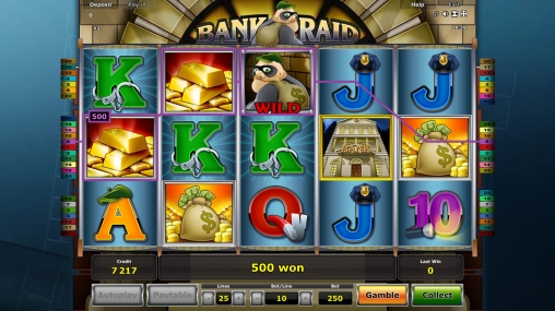 Создатели автомата Bank Raid использовали пять карточных номиналов, «украсив» их наручниками, кепкой грабителя, полицейской фуражкой и другими тематическими предметами. Также на барабанах есть слитки золота, монеты, форма копа, газета со статьей об ограблениях и здание банка.