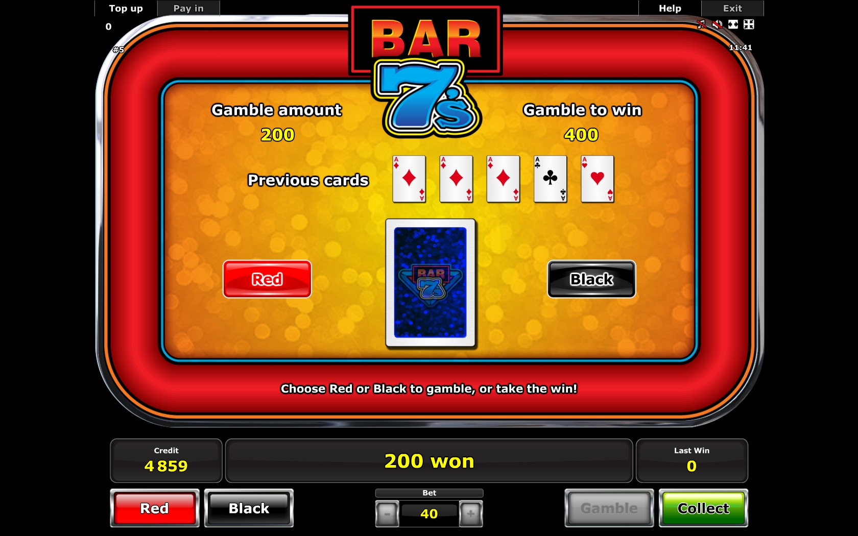 - Gamble – играть на удвоение выплаты