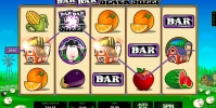 Когда вы запустите игровой автомат Bar Bar Black Sheep, на его экране вы увидите белых и черных овечек, их загон, полоску BAR, а также различные овощи и фрукты. Всего базовых картинок девять.