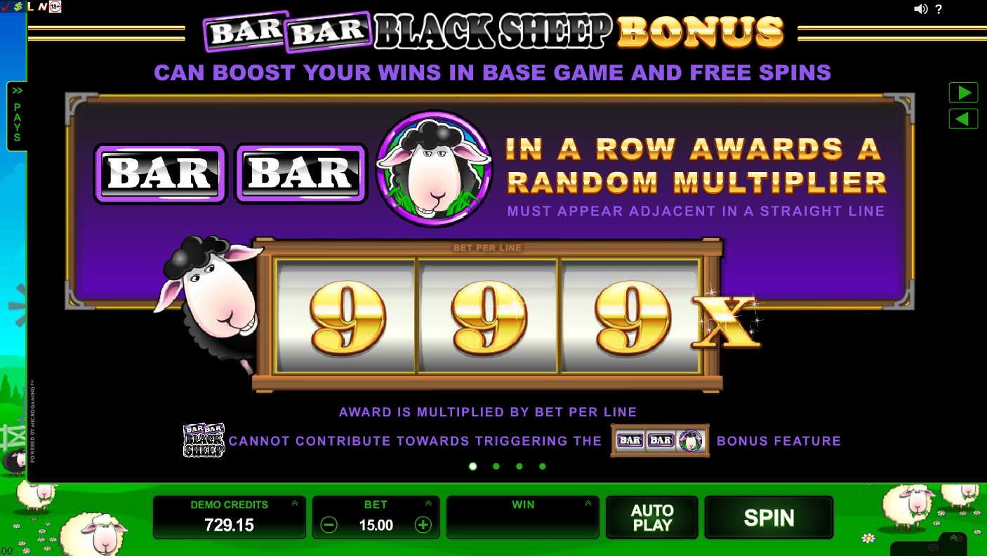 Помимо вышеупомянутых дополнительных возможностей, в Bar Bar Black Sheep есть дополнительный бонус. Он активируется при участии Bar и изображения черной овечки. Когда они формируют на задействованной линии название слота (Bar + Bar + овца), случайным образом определяется множитель, по которому рассчитывается призовая выплата.