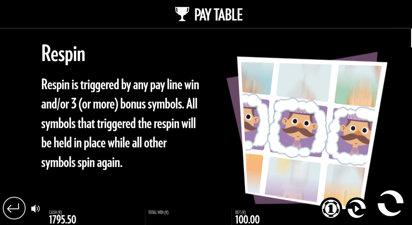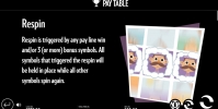 - Respin – Правила респинов обсуждались выше. Добавим, что их также запускают три бонусных картинки. Расположение символов роли не играет.