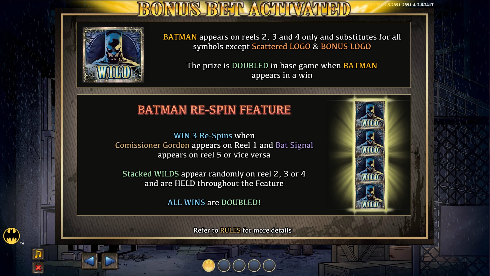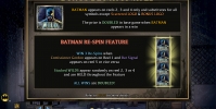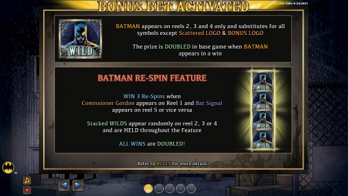 - Wild (Бэтмен) изображен на трех средних барабанах. По этой причине он не может формировать комбинации самостоятельно, однако способен подменять другие базовые изображения в цепочках. Кроме того, он удваивает стандартные коэффициенты, а еще он участвует в призовой функции Batman Re-Spin, о которой читайте ниже.