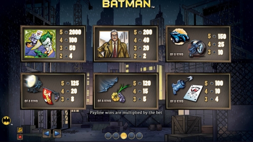 Открыв слот-машину «Бэтмен», вы увидите на экране главного героя и его врага Джокера, а также комиссара Гордона и различные объекты, имеющие отношение к популярному комиксу.