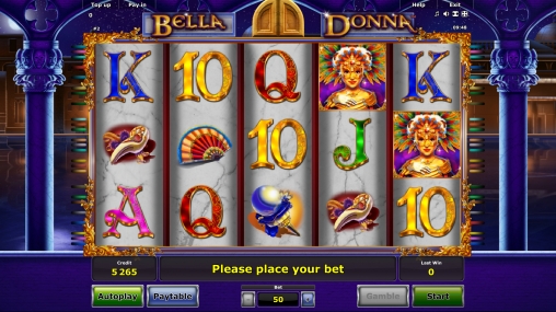 На экране игрового аппарата «Белла Донна» появляются участники карнавала в нарядных костюмах. Также можно увидеть маски, веера и другие тематические предметы. Кроме того, на барабанах изображены номиналы карт от десятки до туза.