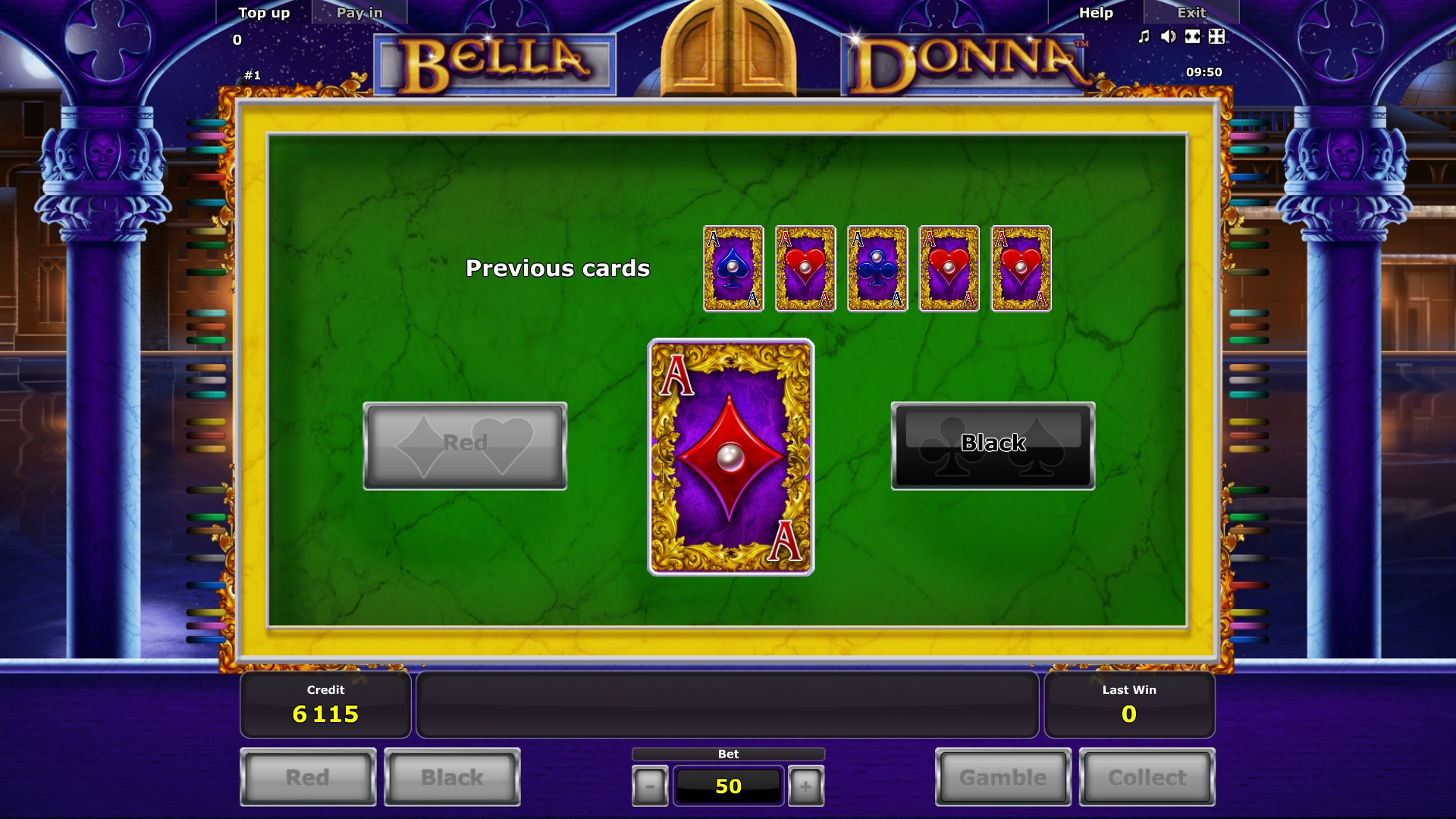 Во втором случае открывается дополнительный экран, на котором видна закрытая карта. Вам нужно угадать ее цвет. Получится – выплата удвоится. Не получится – вы лишитесь кредитов, стоящих на кону. Разрешается играть несколько раз кряду, но права на ошибку нет.