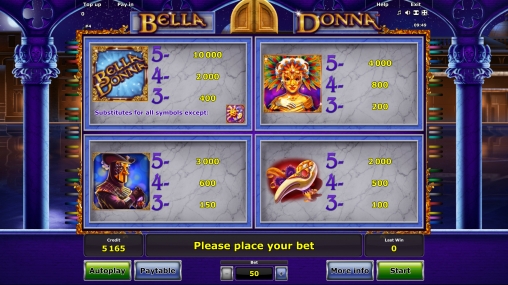 Bella Donna – 5-барабанный игровой автомат с двадцатью пятью постоянно активными полосами, на которых формируются оплачиваемые комбинации. Ставки по ним неизменно равны. На каждую линию можно ставить от двух кредитов до четырехсот. Получается, что на раунд принимается не менее пятидесяти единиц и не более десяти тысяч.