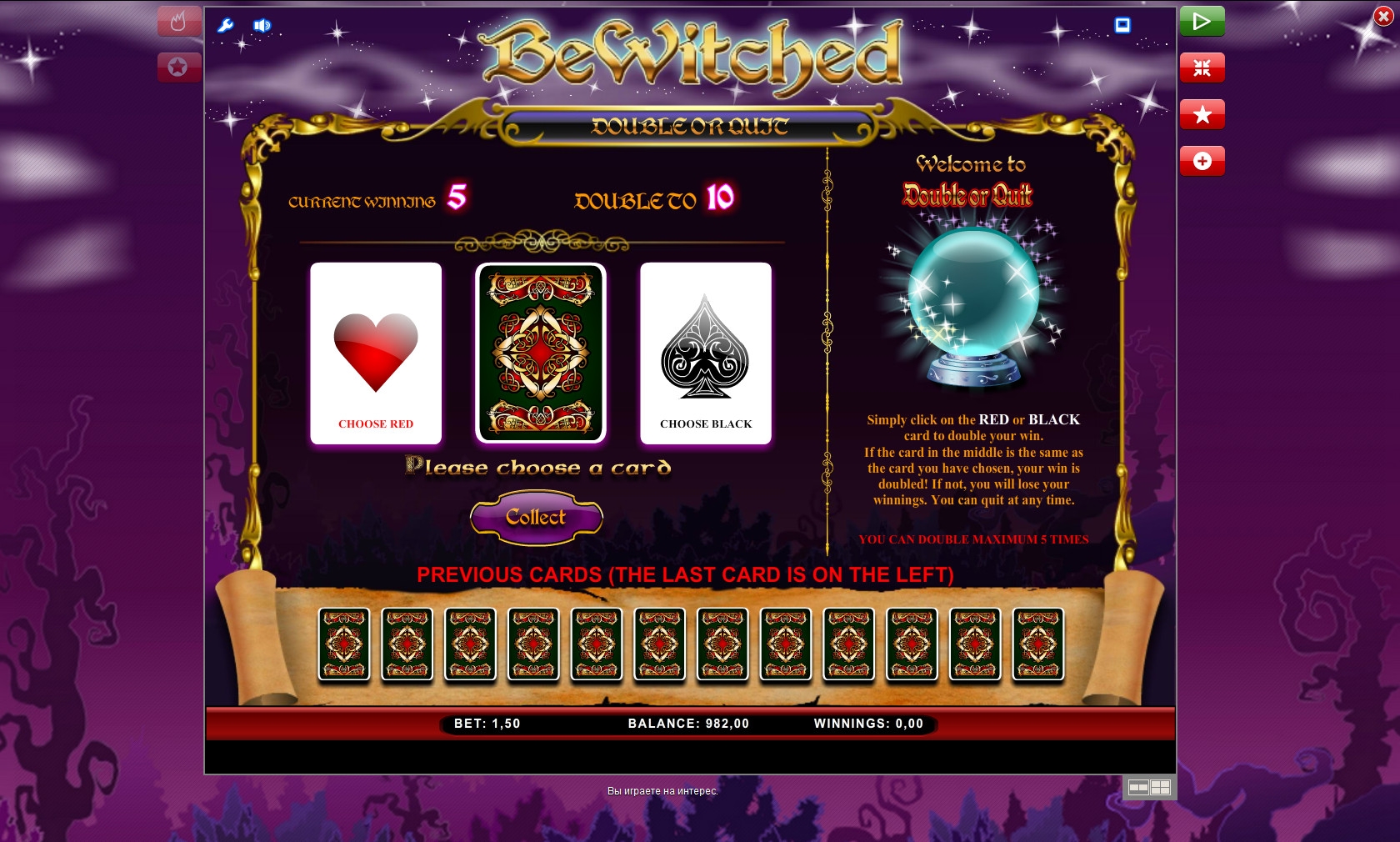 Все деньги, начисленные по результатам раунда, можно забрать после остановки барабанов. Также разрешается принимать участие в игре по шансам. Она выполнена в классическом виде. Вам нужно будет на отдельном экране угадывать цвет карты. Правильный ответ – выплата удваивает. Неправильный выбор – деньги уходят в казино. Подряд можно играть несколько раз, но ошибаться нельзя.