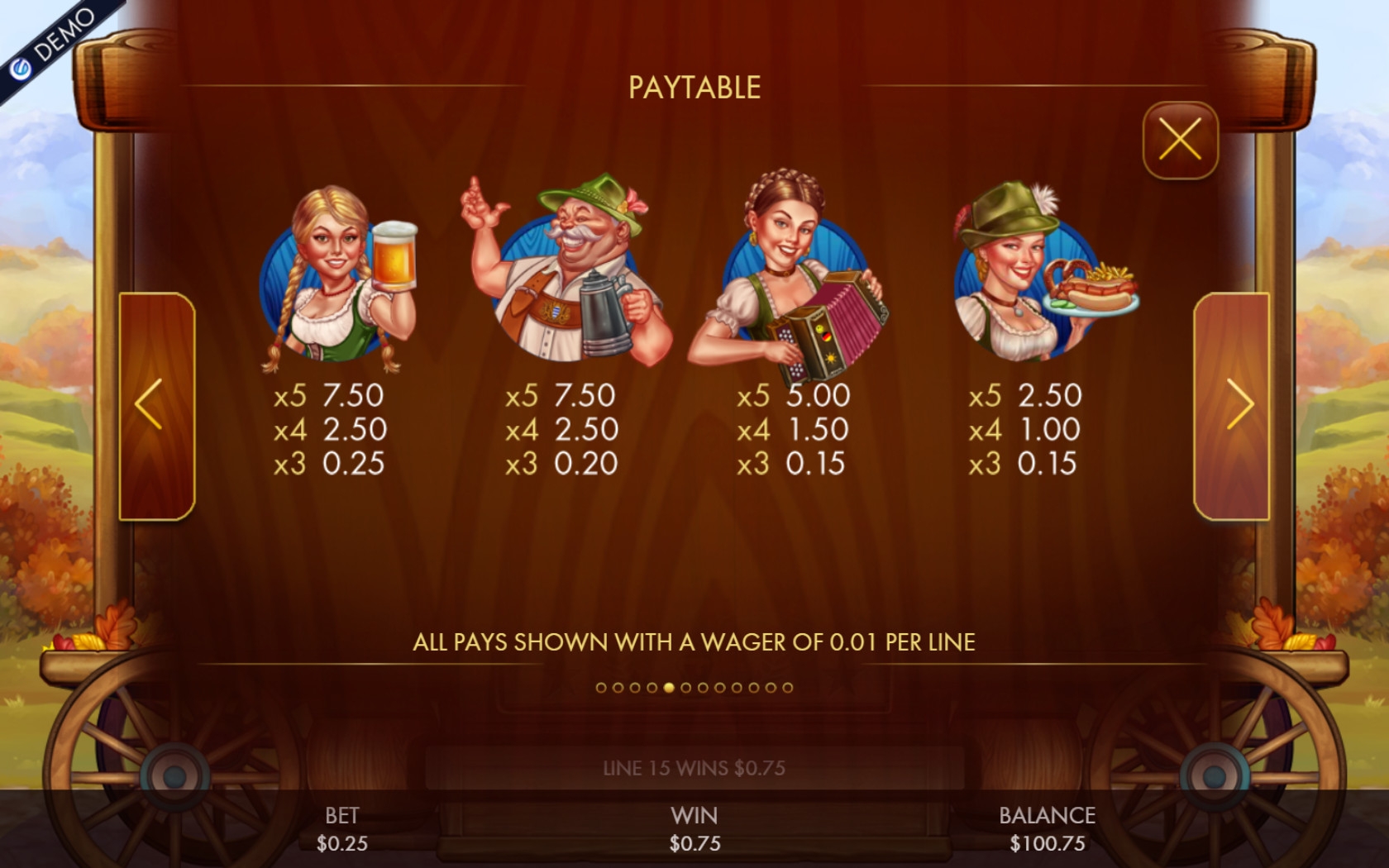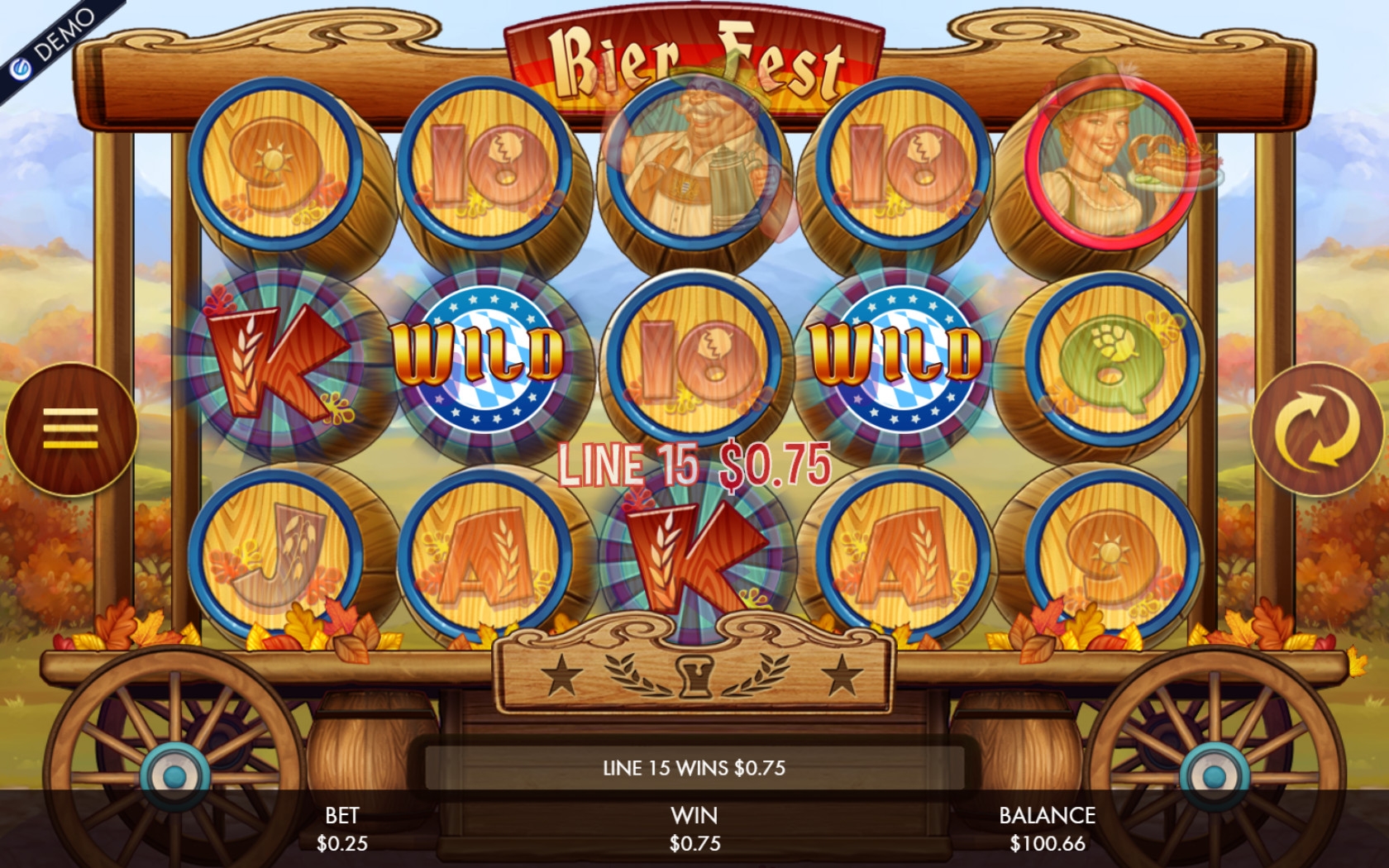 Даже если вы будете играть на видео-слоте Bier Fest без перевода, не зная английского языка, вы запросто разберетесь во всех кнопках. На основных элементах управления даже нет надписей.