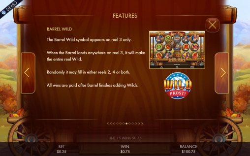 - Barrel Wild можно увидеть лишь в третьей колонке. Появляясь на экране, он расширяется на все три позиции по вертикали. Иногда он также может занять второй и/или четвертый барабаны. Затем он выполняет функции обычного Wild (то есть, заменяет прочие картинки).