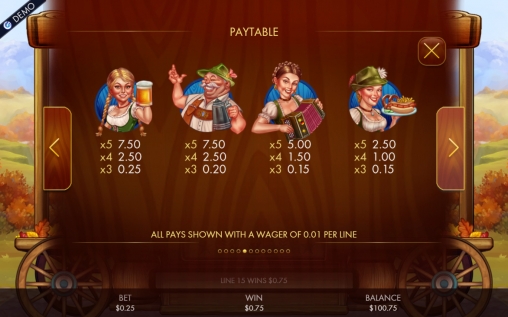 «Праздник пива» является 5-барабанным автоматом, с пятнадцатью картинками на экране и двадцатью пятью постоянно задействованными линиями, по которым принимаются равные ставки. Диапазон по каждой из них варьируется от одного цента до десяти долларов. Таким образом, на раунд можно ставить не менее двадцати пяти центов и не более двухсот пятидесяти долларов.