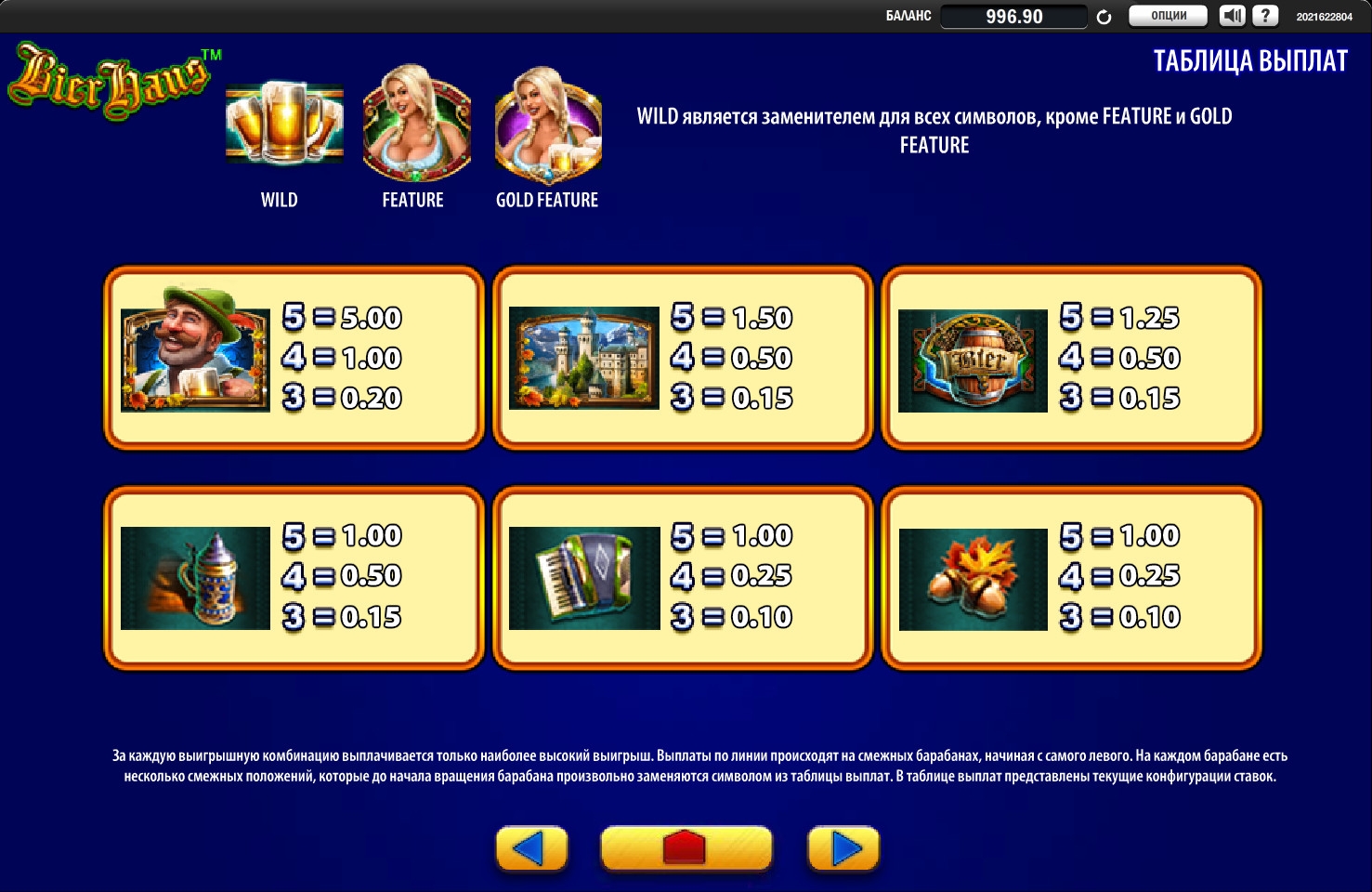 Специальными картинками, выполняющими особые функции, являются Wild (три бокала с пивом), Feature (грудастая блондинка) и Gold Feature (та же девушка с бокалами). Рассмотрим их возможности подробнее: