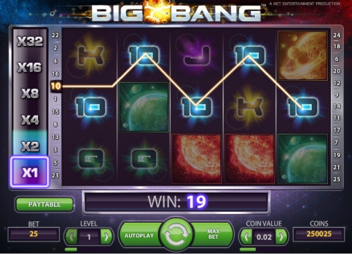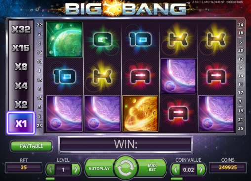 Big Bang – пятибарабанный видео-слот с двадцатью пятью линиями. Он имеет три ряда картинок на экране, интересную систему включения дополнительных множителей, особые символы и другие опции. Игры по шансам в Big Bang нет.
