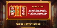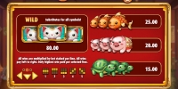 В столбцах видео-слота появляются китайские монетки, золотые колокольчики, мешочки с иероглифами, розовые веера, трещотки и фарфоровые статуэтки черепах, поросят и рыбок. Одинаковые картинки выпадают в колонках вертикальными стеками.