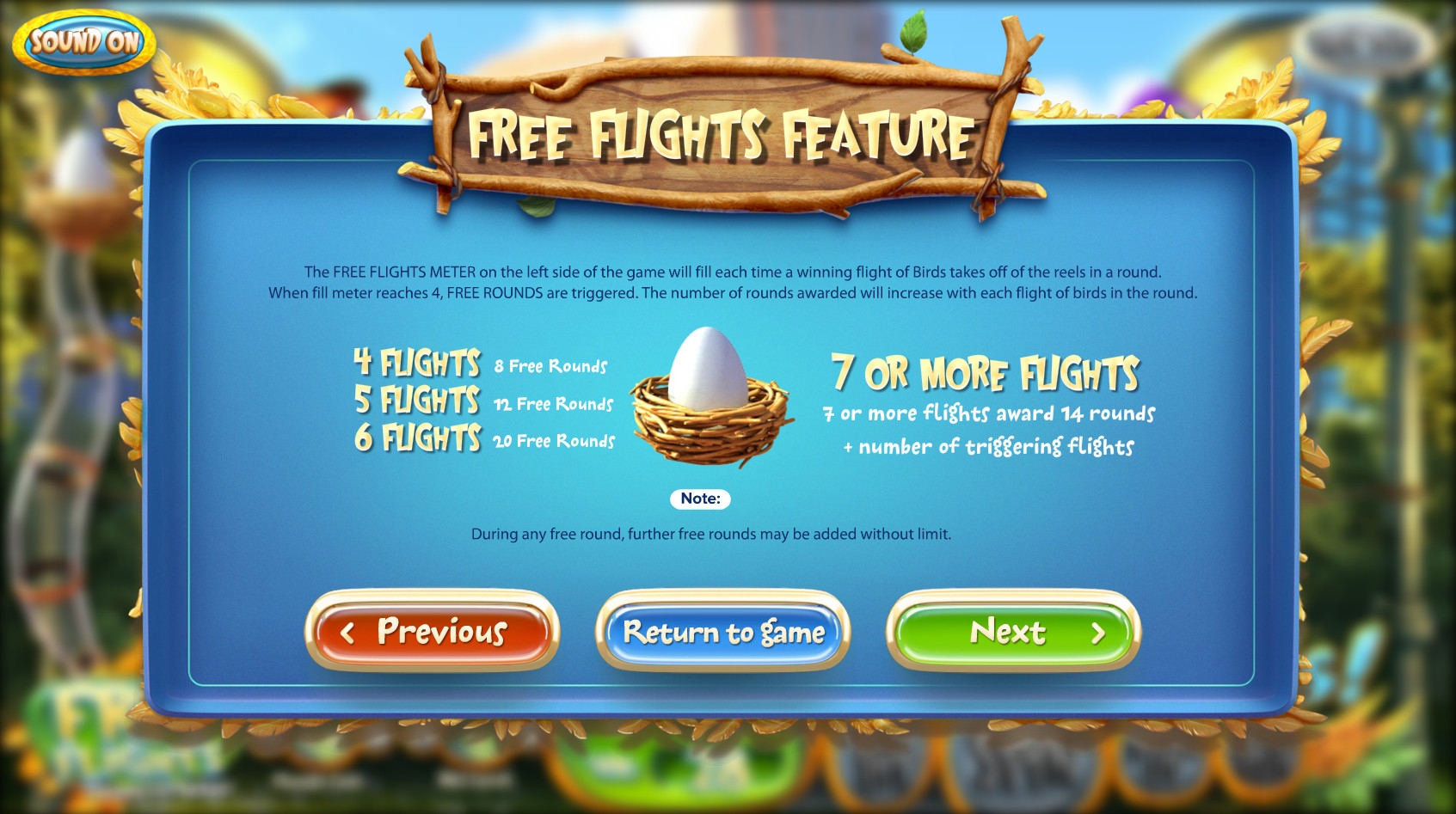 В игровой автомате «Птички» есть призовой раунд в виде бесплатных вращений. Они запускаются, когда заполняется шкала Free Flights Tweet ‘O’ Meter. Она располагается слева от экрана и имеет четыре деления, которые наполняются водой по одному при каждой смене птичек в результате образования комбинаций. Если уровень жидкости доходит до гнезда с яйцом, начинаются фри-спины.