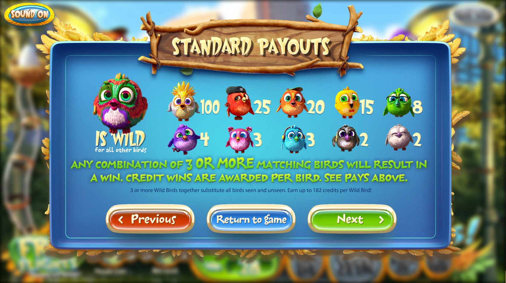 Размер выплат определяется в каждом случае перемножением ставки на коэффициент полученной комбинации (от х2 до х100). После начисления выигрыша птички, которые образовали цепочку, вспархивают и улетают. Располагающиеся выше персонажи опускаются на освободившиеся места, а другие пустые позиции заполняют новые птицы. Если снова образуются комбинации, по ним тоже начисляются выплаты, а затем процесс развивается по той же схеме.