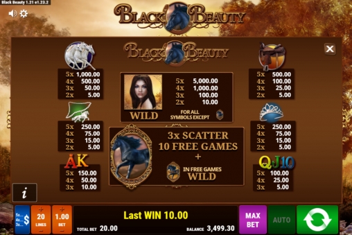 Онлайн-автомат Black Beauty состоит из пяти барабанов. Играть разрешается по десяти или двадцати активным полосам, сделав на них равные ставки. На каждую принимается от одного цента до двух долларов (0.10 – 40 долларов на спин).