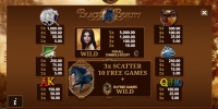 Расчет выигрышей осуществляется по двум параметрам: ставка по одной линии умножается на специальный коэффициент, выделенный для сложившейся комбинации. В Black Beauty он бывает от х5 до х5000. По результатам раунда могут быть сразу несколько выплат, но с каждой полосы учитывается лишь лучший вариант.