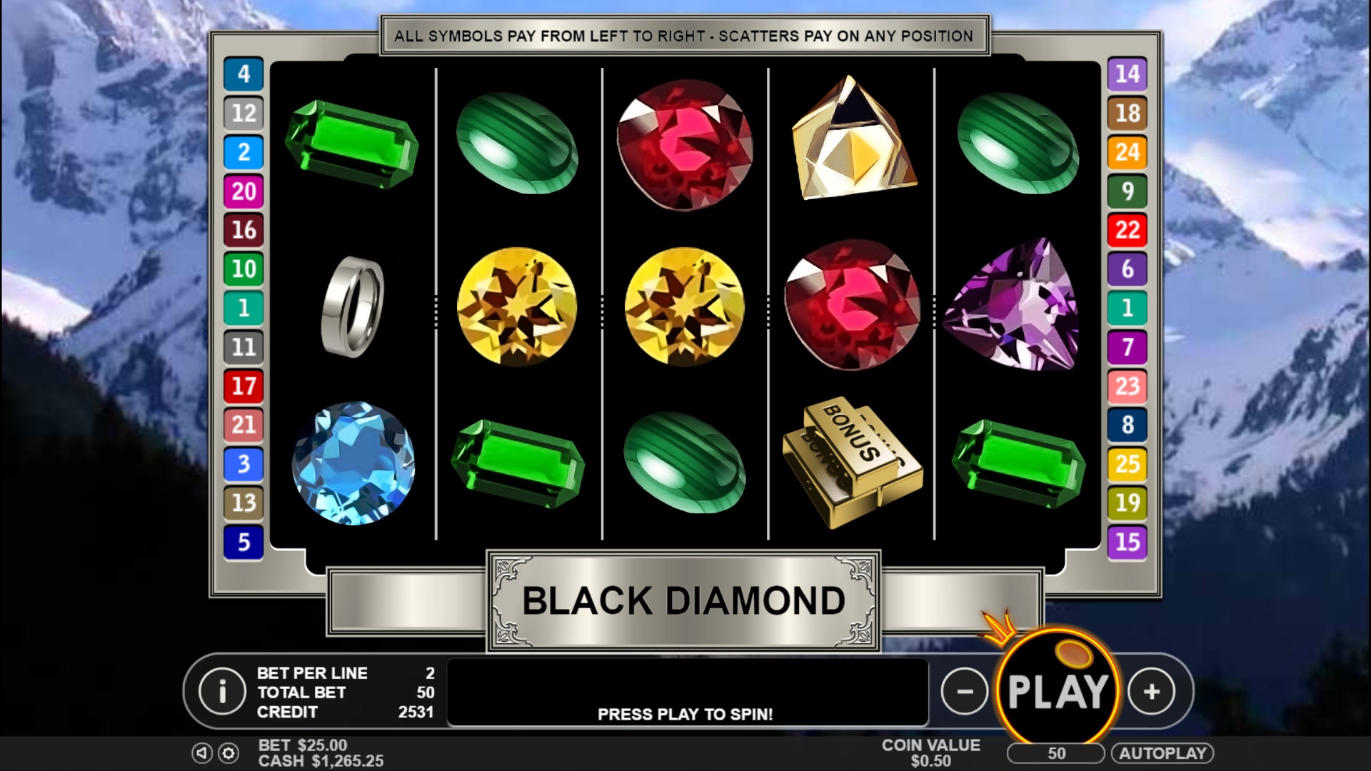 Бесплатная версия Black Diamond для тестирования в демо-режиме есть прямо на Casinoz.biz. Чтобы играть на деньги, регистрируйте аккаунт в одном из казино, использующих софт Pragmatic Play.
