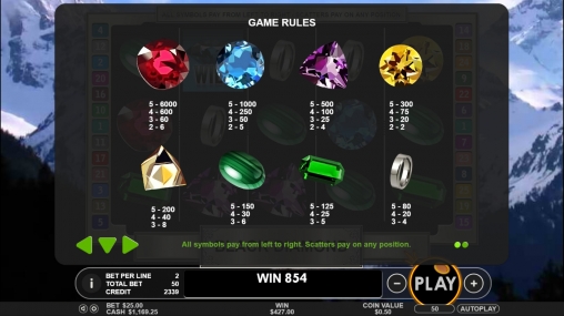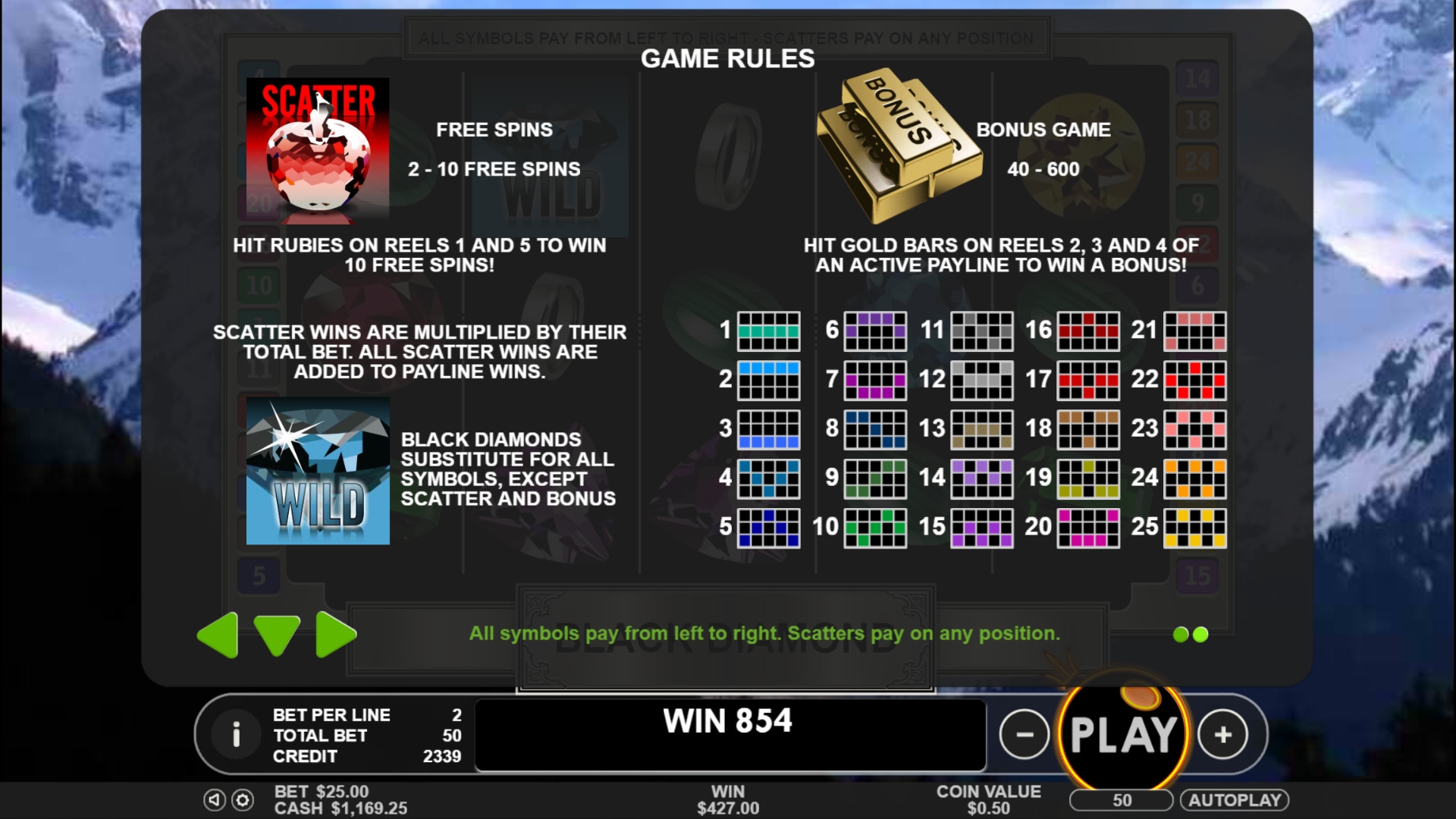 Расчет выплат осуществляется по традиционным принципам: ставка по одной полосе умножается на специальный коэффициент, выделенный для каждой из доступных в игре комбинаций. Он бывает в Black Diamond от х2 до х6000.