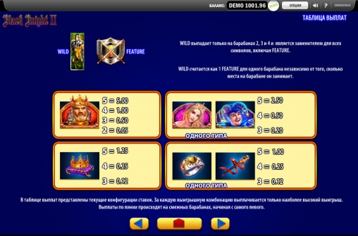 В число доступных игровых функций видео-слота Black Knight II входят особые символы, призовые вращения и другие опции. Рискованная игра по шансам не предусмотрена правилами.