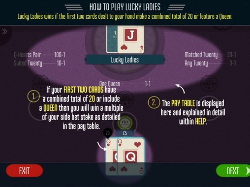 В Blackjack Lucky Ladies предусмотрена возможность делать побочную ставку на каждый из задействованных боксов. Ее разрешается осуществлять лишь при наличии основной ставки, но играет она независимо. Выплаты по ней начисляются, если в первых двух картах будет двадцать очков, или в них окажется одна или две дамы. Выигрыши рассчитываются по следующим коэффициентам: