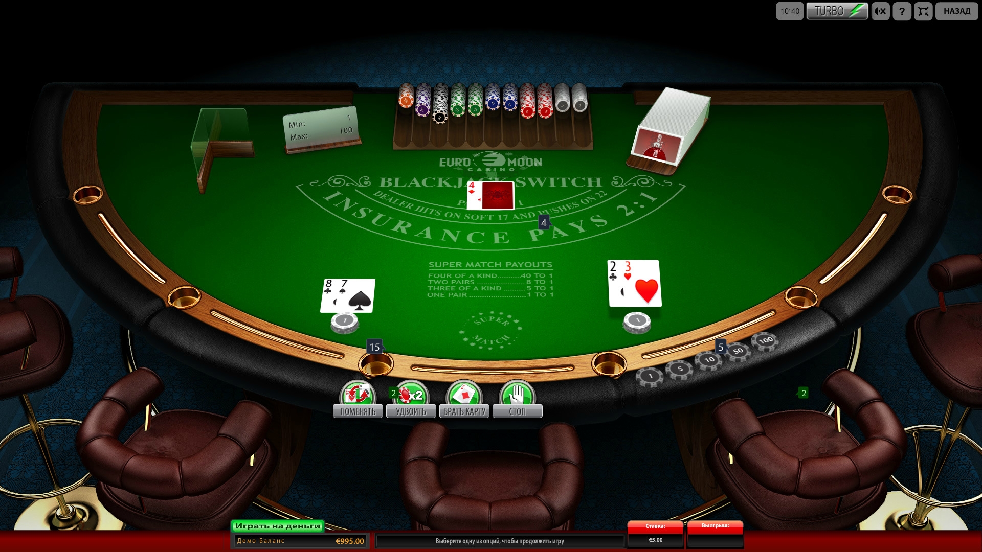 Есть режим турбо, ускоряющий игровой процесс, а также ряд других настроек звука и экрана. Скачивать Blackjack Switch нет необходимости. Модель открывается в браузере.
