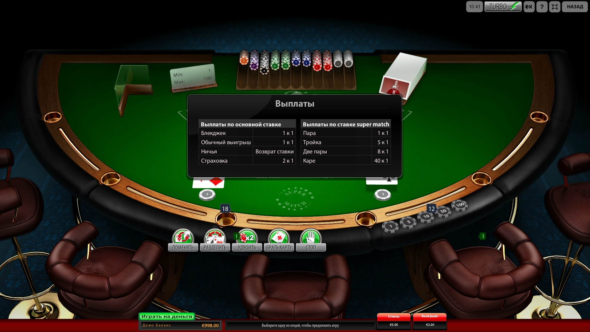 Играть в блэкджек свитч можно лишь на два бокса, поставив на них от одного до ста кредитов. Ставки обязательно должны быть равными. О дополнительной ставке Super Match рассказывается в следующем разделе статьи.