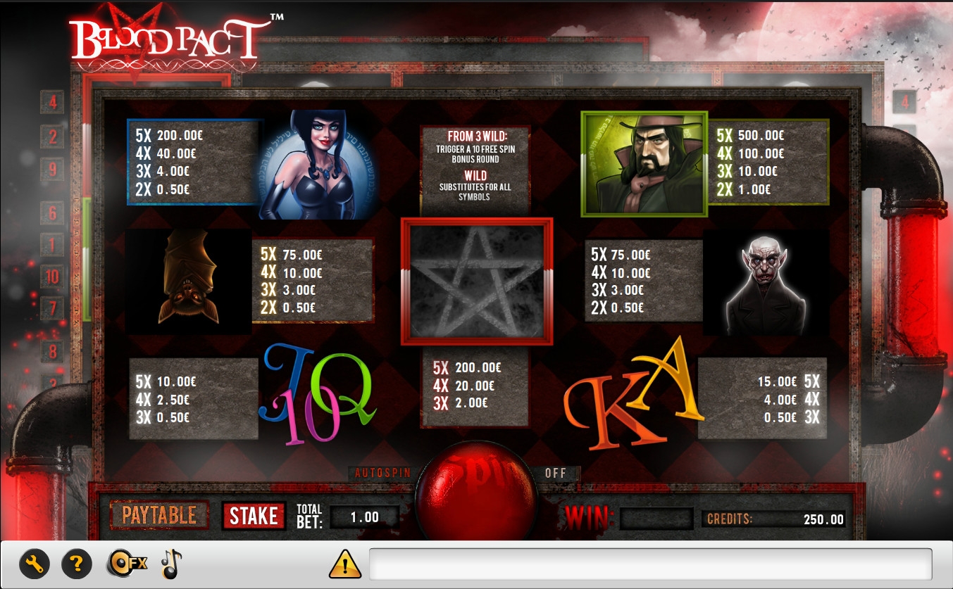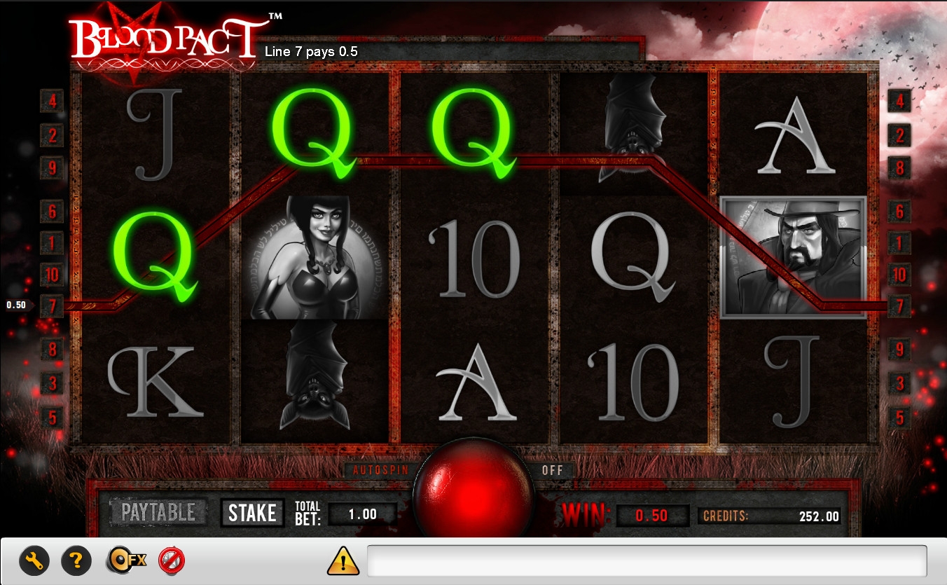 Blood Pact является 5-барабанным видео-слотом с десятью постоянно задействованными линиями. По каждой позиции разрешается ставить от двух центов до двух с половиной долларов (на примере NetBet Casino). Таким образом, максимальная ставка на спин ограничена двадцатью пятью долларами.