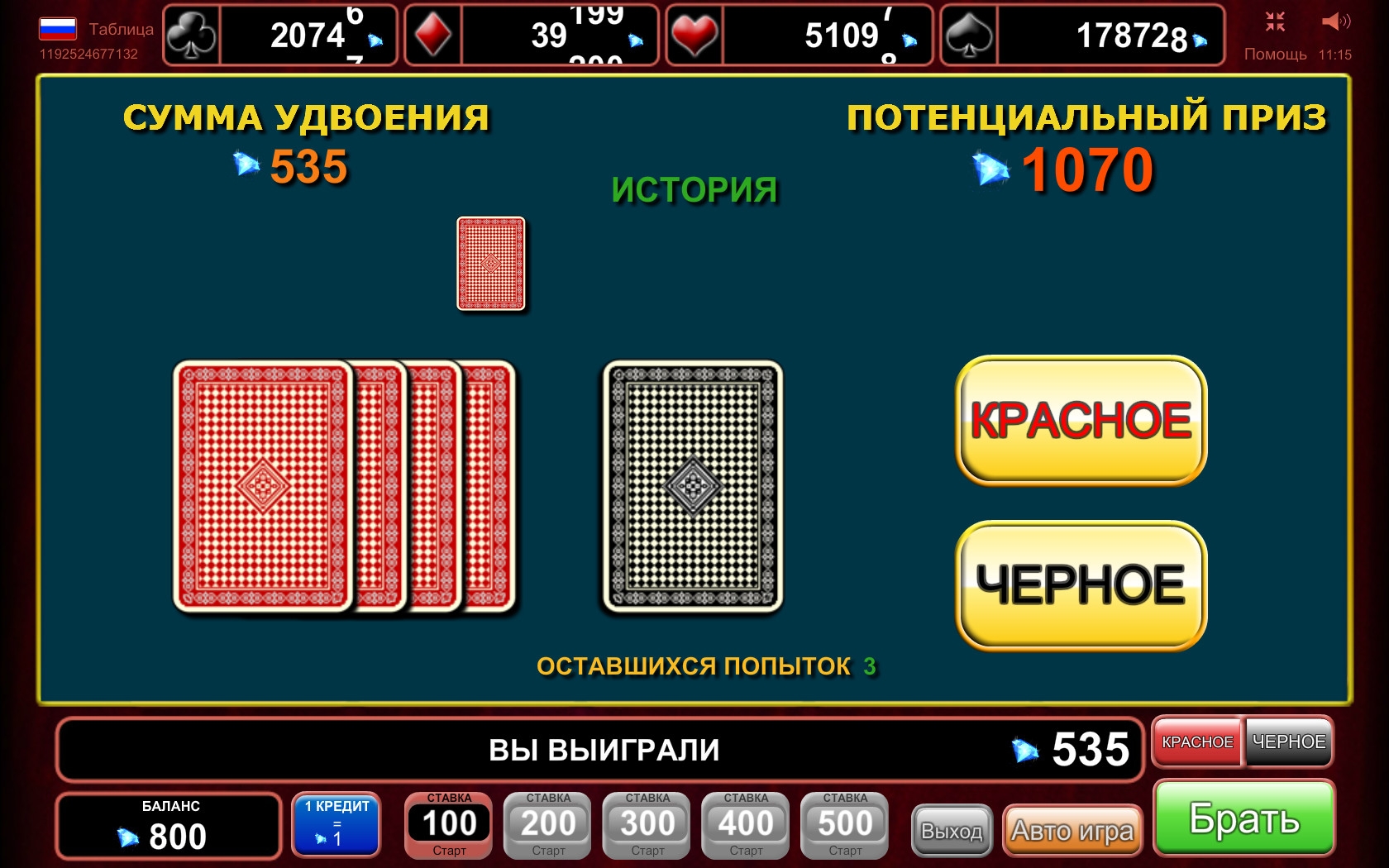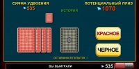 Данный раунд, открывающийся на дополнительном экране, предполагает угадывание цвета закрытой карты. Клиент должен выбрать красный или черный цвет. При верном ответе его выигрыш увеличивается в два раза. При ошибке он лишается денег. О лимитах читайте в правилах. В одном подходе можно действовать не более пяти раз подряд.