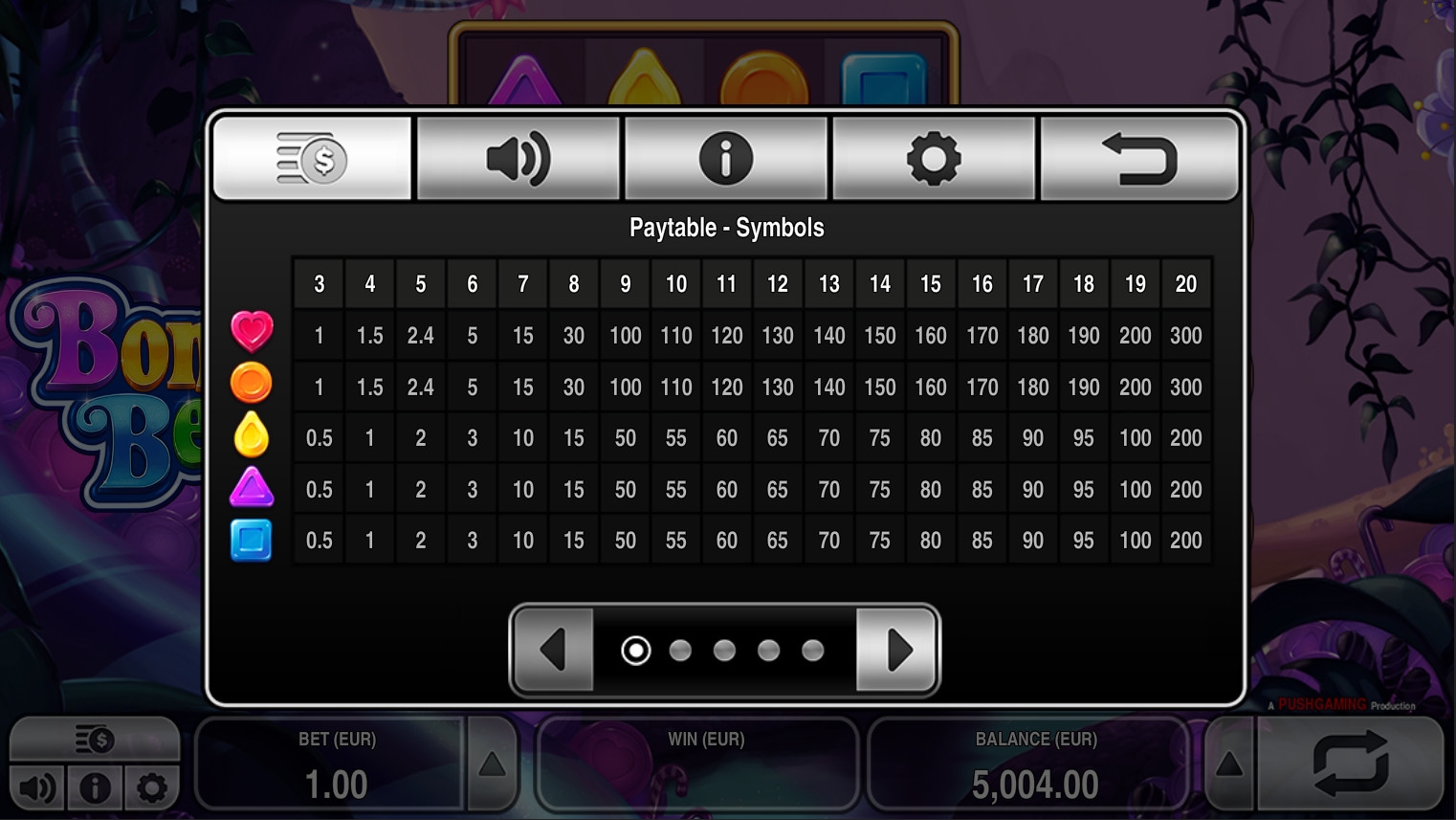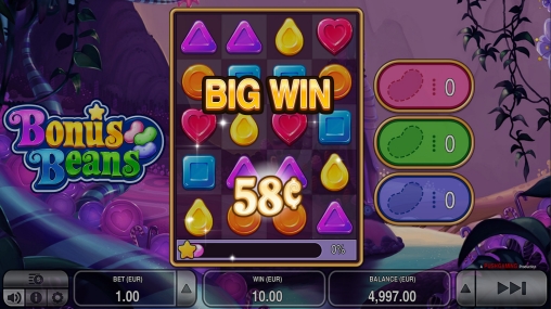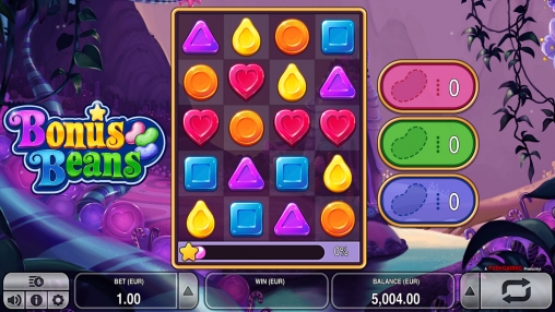 В Bonus Beans представлено пять типов обычных картинок. Они представляют собой леденцы в форме сердечка, круга, квадрата, треугольника и капельки. Возможны ситуации, когда один элемент занимает все двадцать позиций на экране. Все они будут считаться единой комбинацией из двадцати единиц.