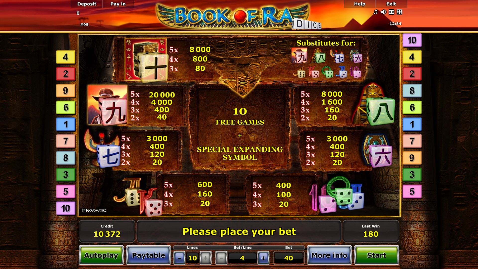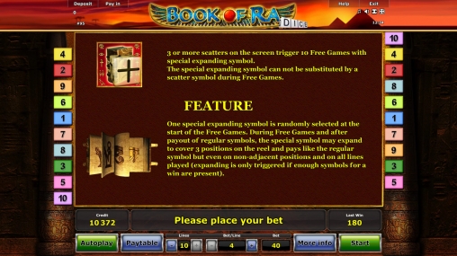 Особые символы и призовые функции обсуждаются ниже в обзоре Book of Ra Dice.