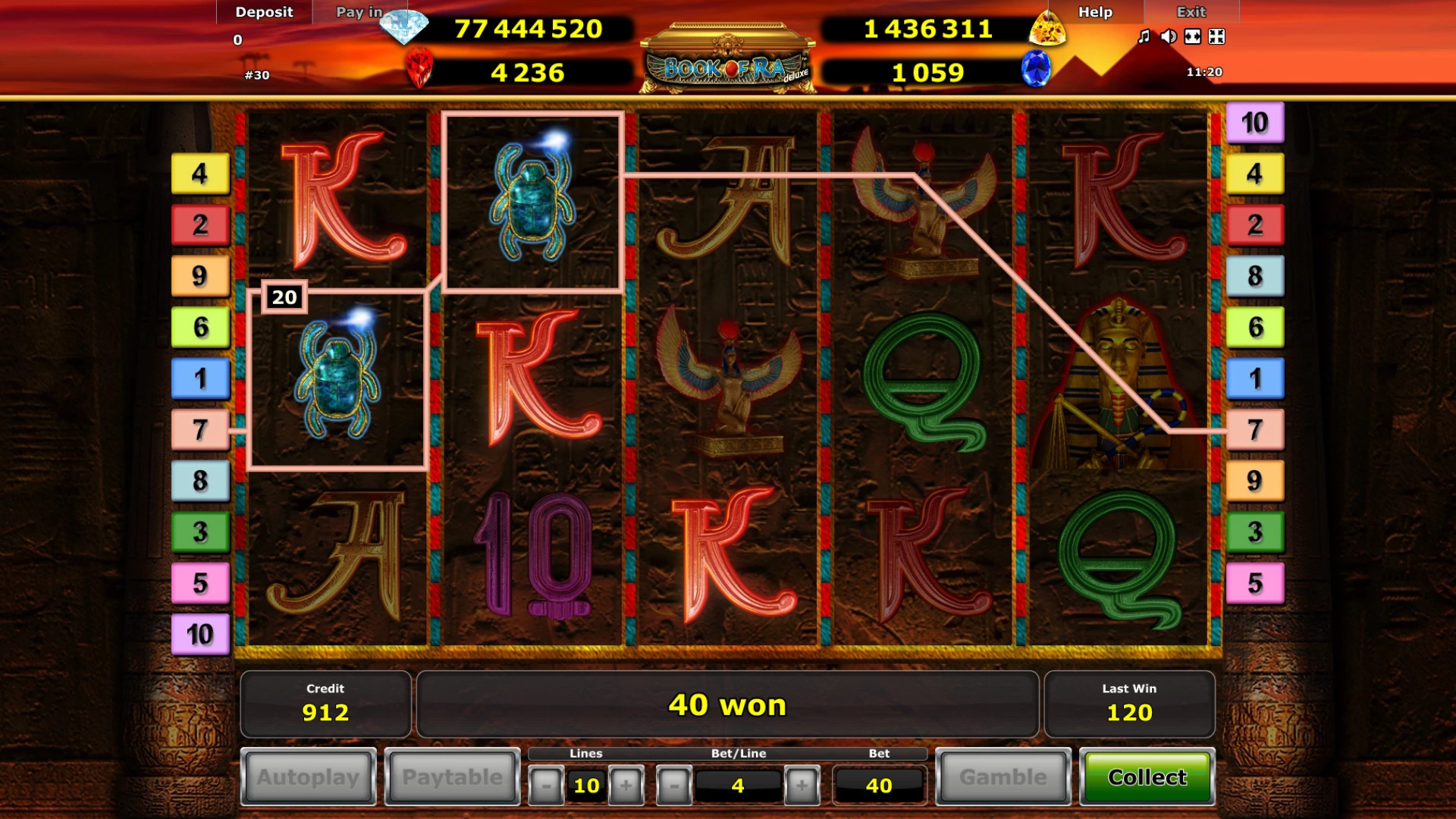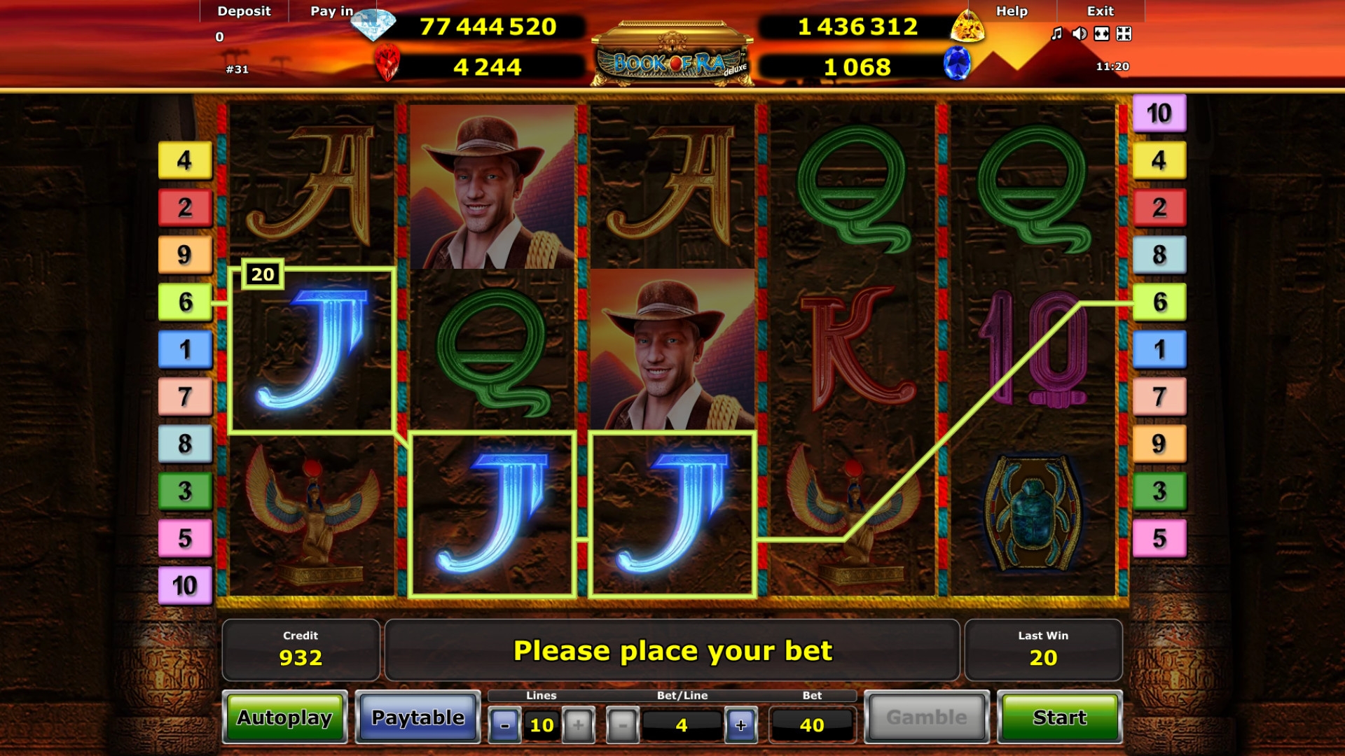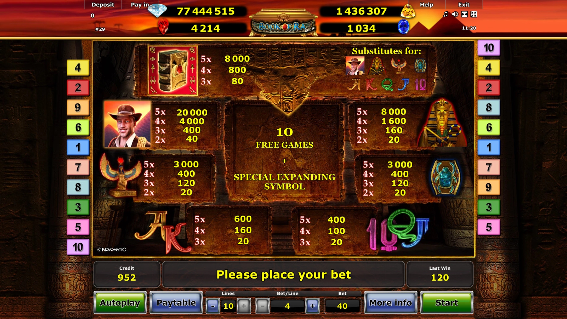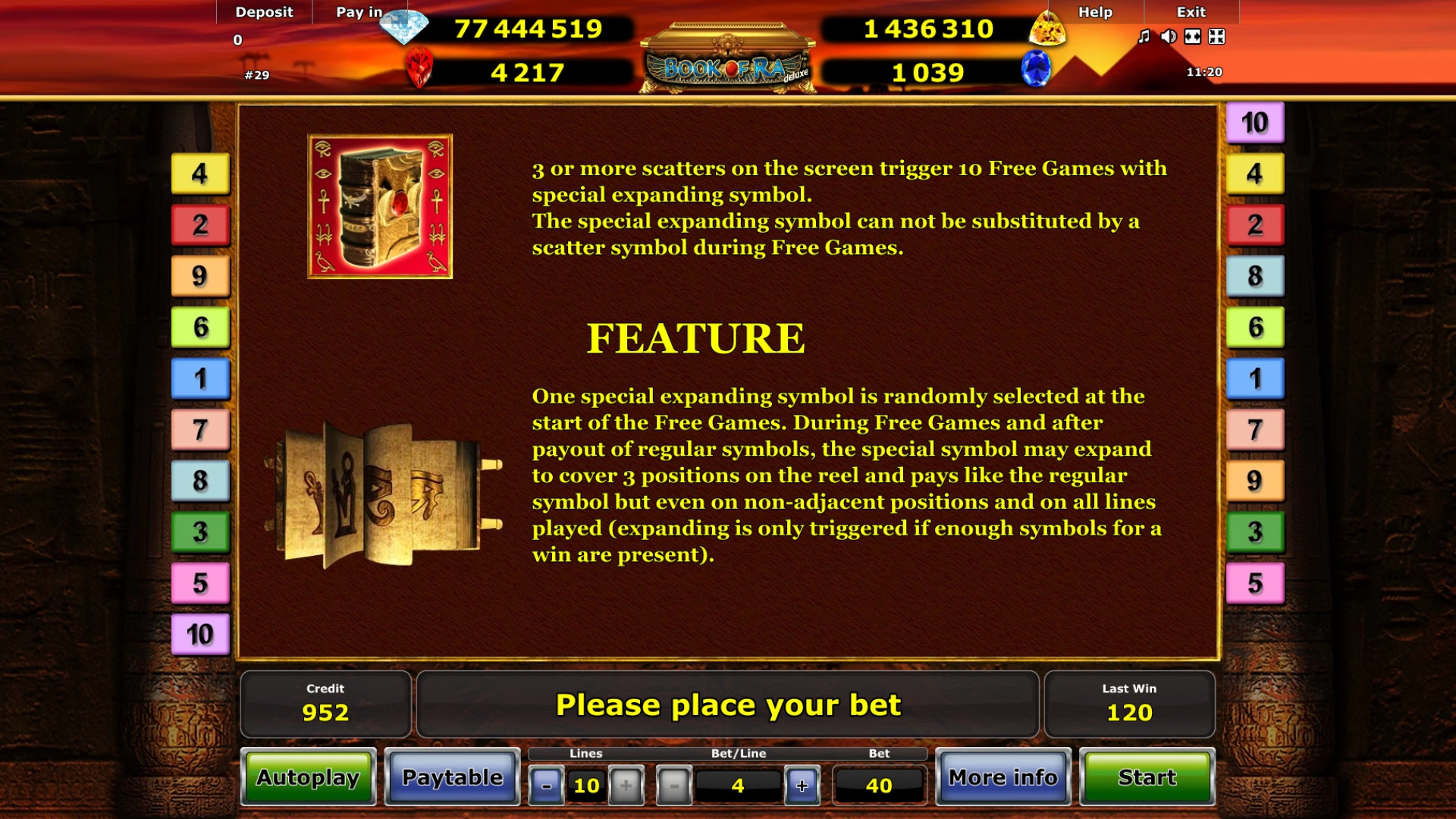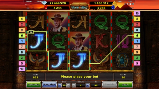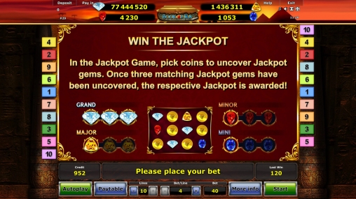 В игровом автомате Book of Ra Jackpot Edition пять барабанов, десять линий и пятнадцать ячеек для символов на главном экране.