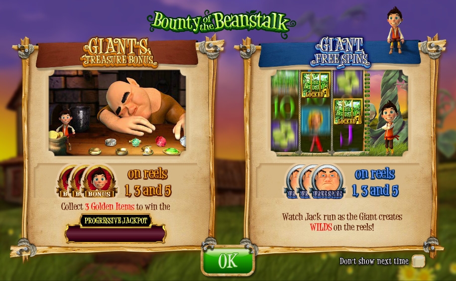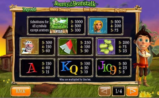 Bounty of the Beanstalk – 3D видео-слот с пятью барабанами и четырьмя рядами картинок на экране. Играть на игровом автомате можно по одной, десяти, двадцати, тридцати, сорока или пятидесяти активным линиям. На отдельной странице правил есть схема их расположения.