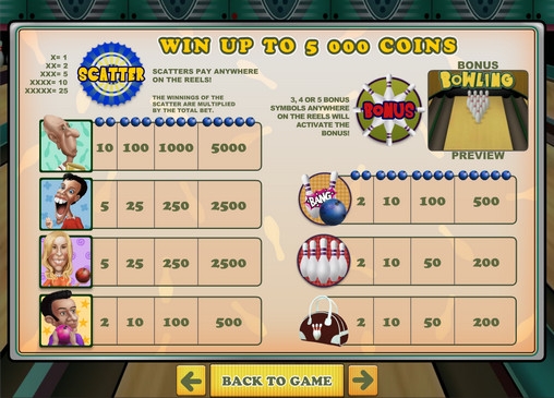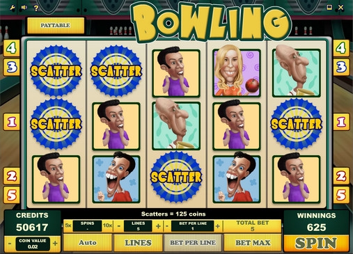 На барабанах игрового автомата изображены очень смешные посетители кегельбана, кегли, шары и прочий инвентарь. Также в видео-слоте Bowling есть особые символы Scatter и Bonus.