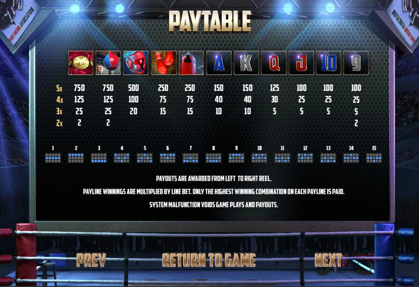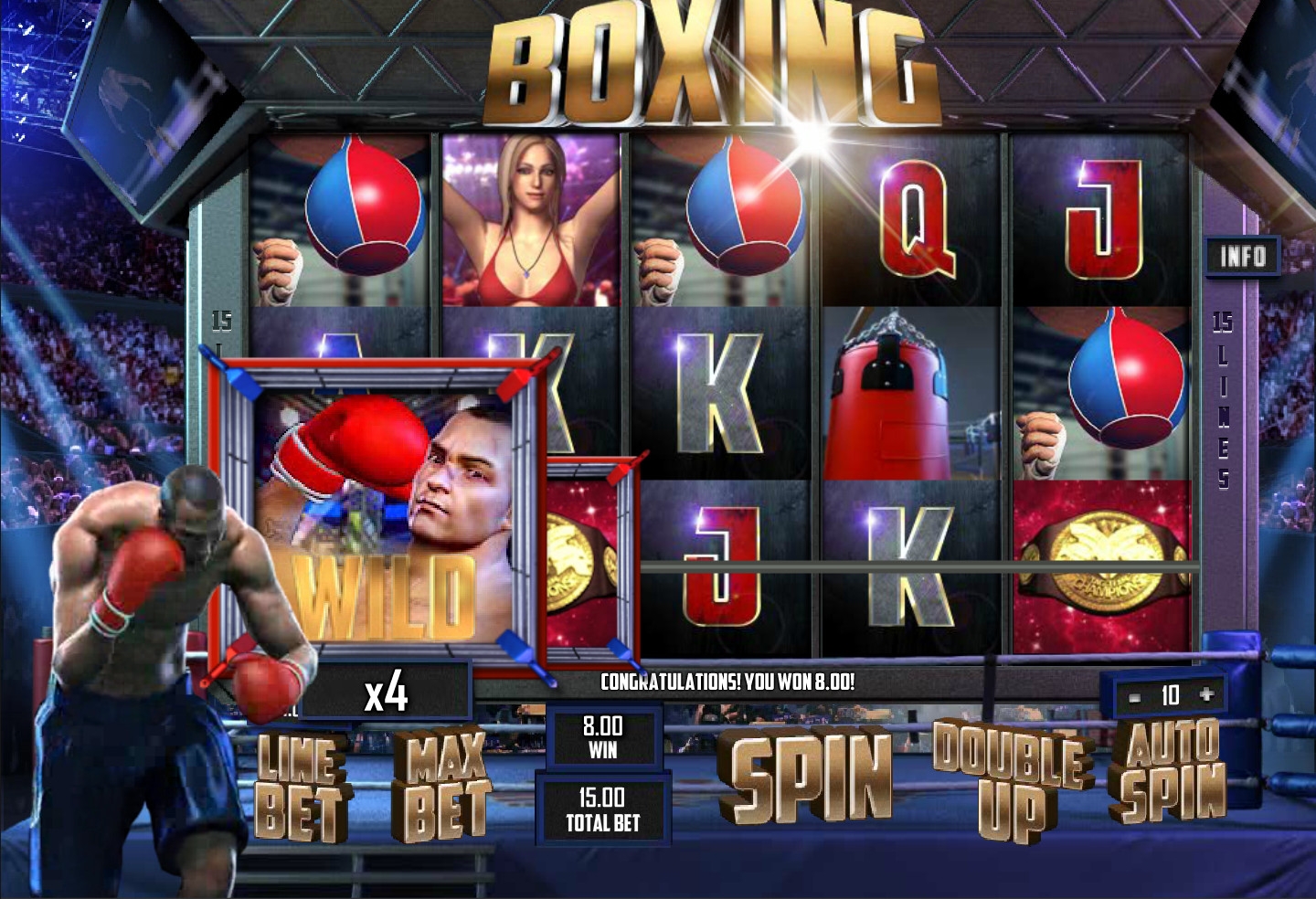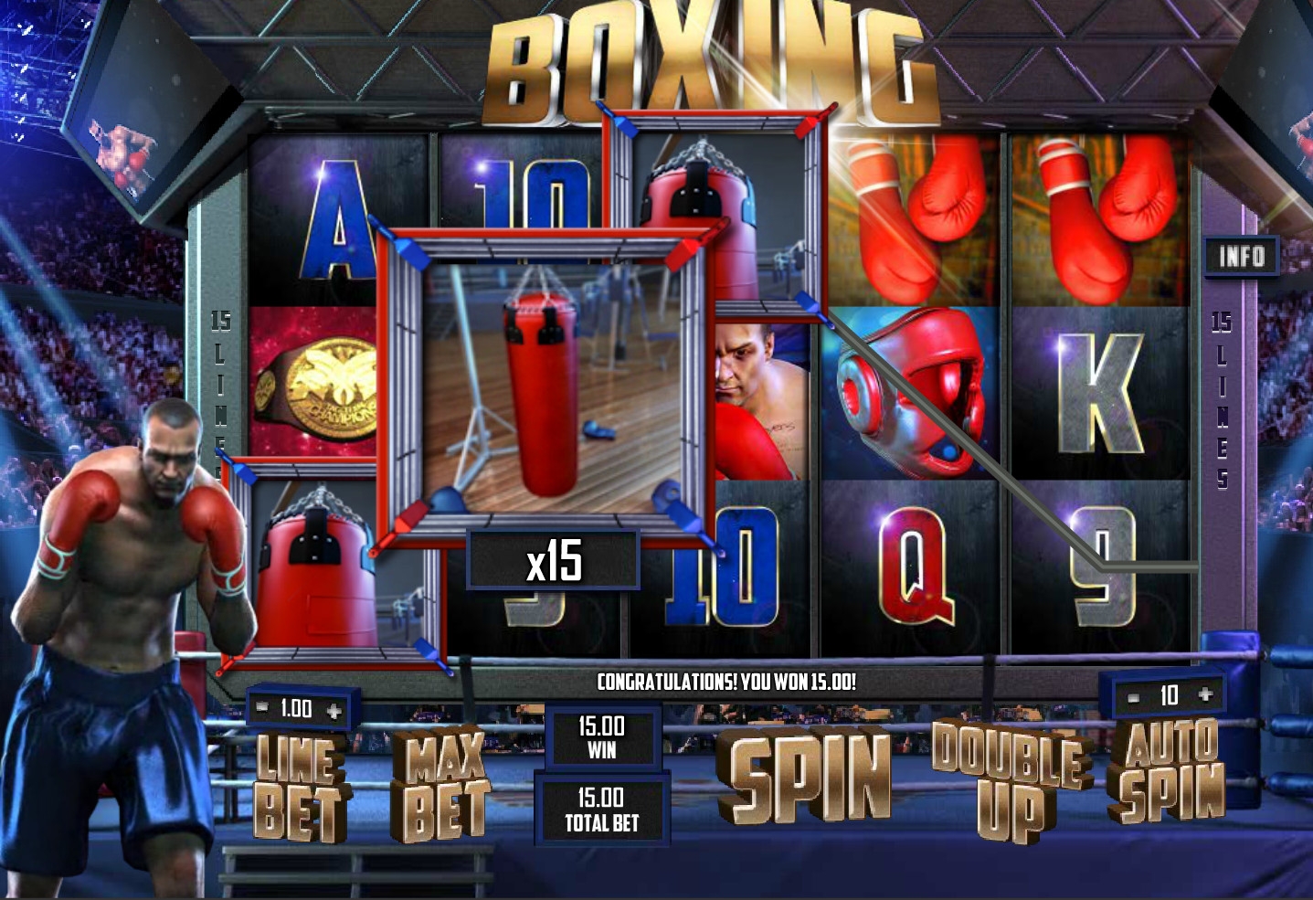 В Boxing пять барабанов и пятнадцать картинок на главном экране. Играть на игровом автомате можно лишь по пятнадцати задействованным полосам, сделав по ним равных ставки. На каждую позицию принимается от десяти центов до шести долларов. Выходит, что диапазон ставок на раунд простирается от полутора до девяноста долларов.