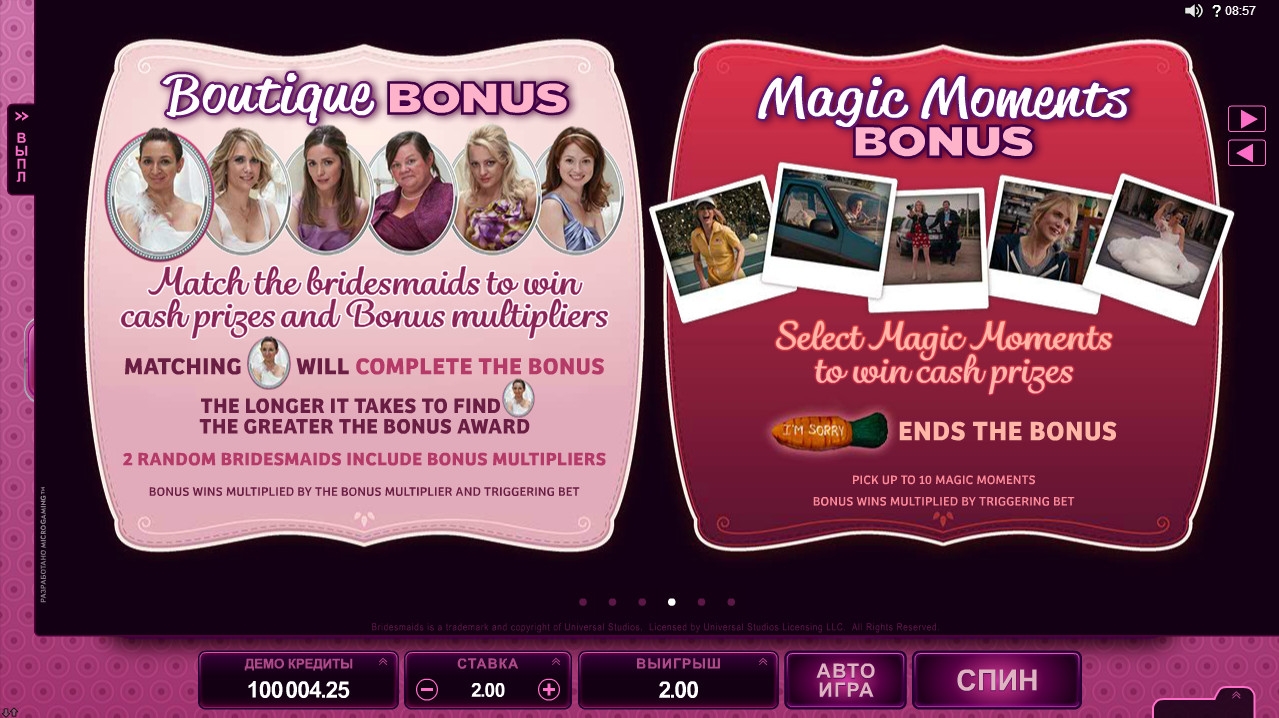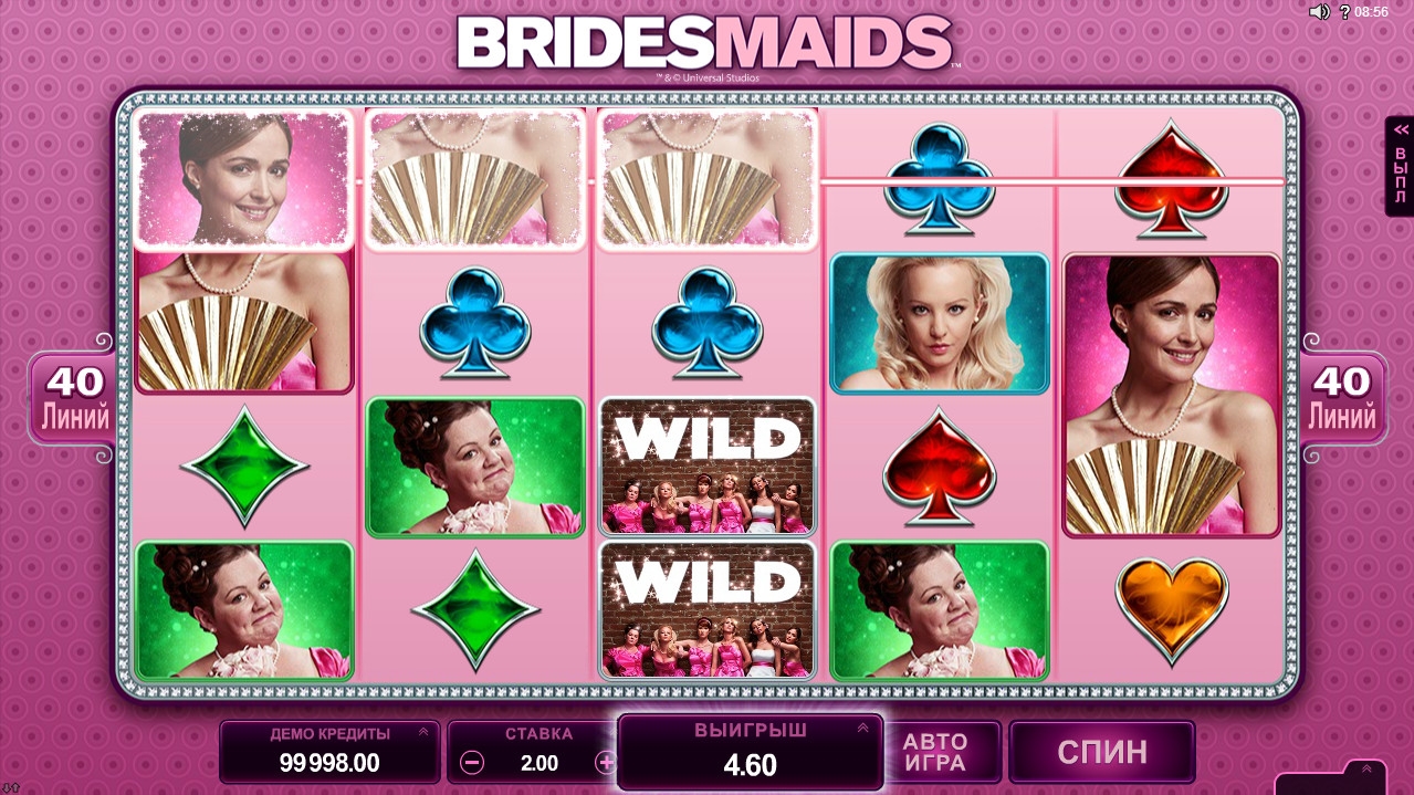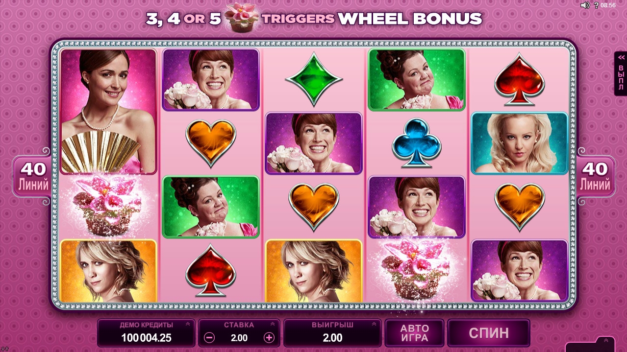 Особыми возможностями обладают Stacked Wild (логотип Bridesmaids) и Scatter (пирожное в виде цветка). Далее об их функциях: