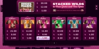 - Stacked Wild идет на барабанах полосами и образует комбинации сам по себе. Он также помогает составлять выигрышные цепочки из других картинок, кроме скаттеров, оказываясь на соответствующих позициях.