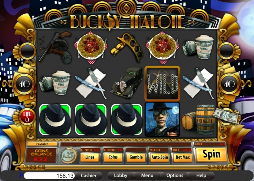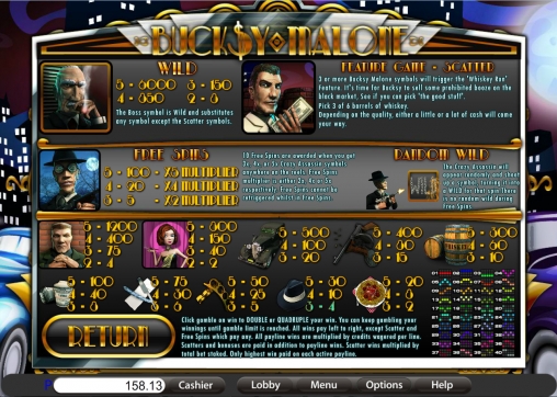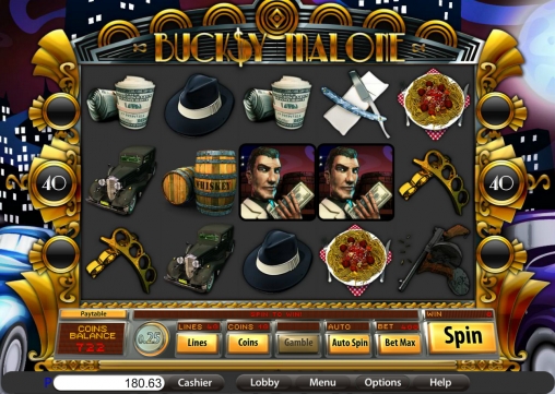 В Bucksy Malone пять барабанов. На каждом из них после остановки видны по три изображения. Следовательно, элементы выстраиваются на экране в три ряда. В игре представлены обычные картинки, особые символы, призовые спины с увеличенными коэффициентами, тематический бонусный раунд и другие опции.