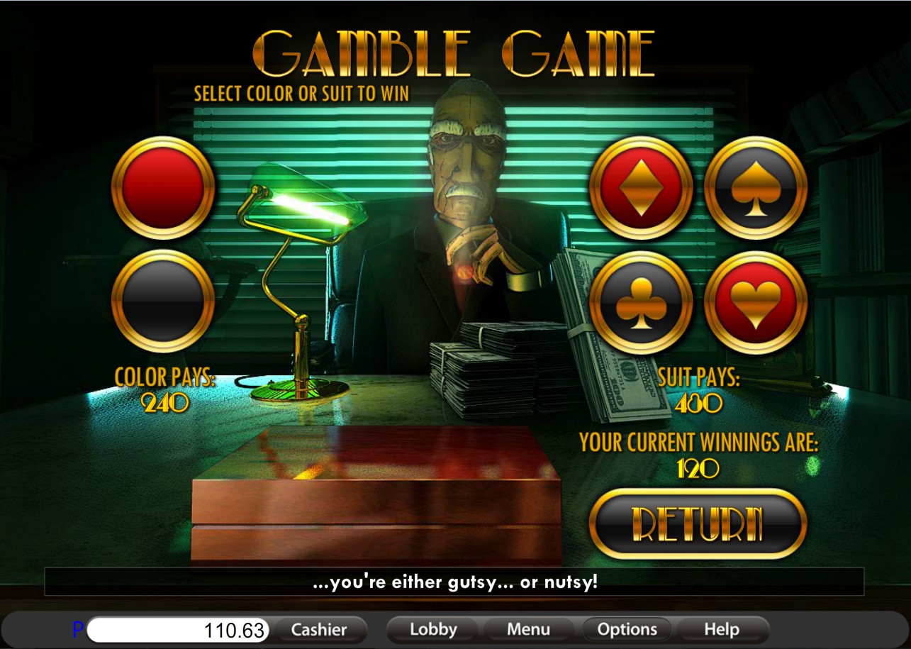Он выдержан в традиционном стиле, но оформлен в соответствии с тематикой слот-машины. Вы увидите босса мафии, который предложит вам угадать либо цвет, либо масть (выбирать вы будете сами) закрытой карты. Если вы правильно назовете цвет, выигрыш удвоится. Но если вам удастся угадать масть, выплата увеличится в четыре раза. Подряд можно играть до пяти раз подряд.