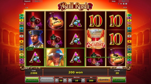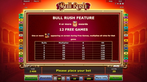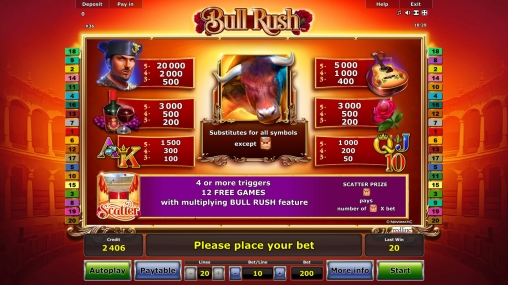 Игровой автомат Bull Rush студии Novomatic посвящен испанским национальным обычаям, в которых принимают участие быки. Речь идет о корриде и энсьерро, или убегании от быков, несущихся по улицам города. Эти экстремальные развлечения пользуются огромной популярностью у местных жителей и многочисленных туристов.