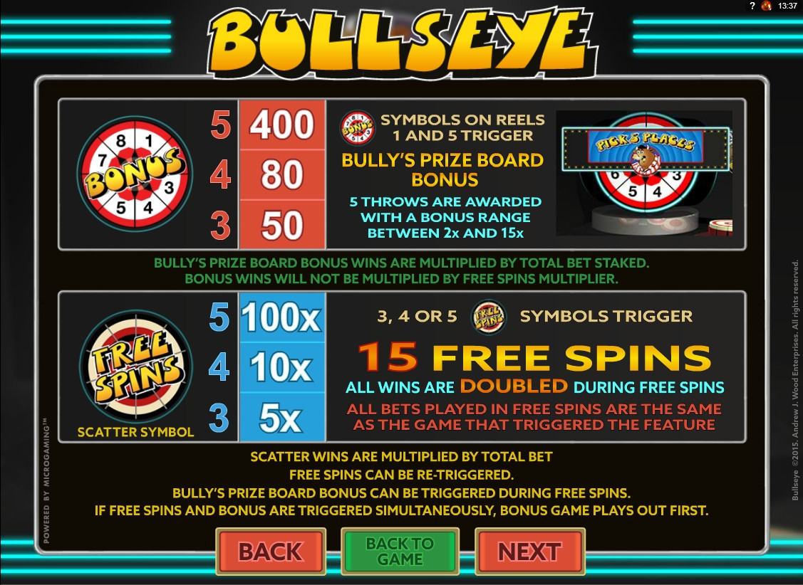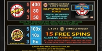 Призовой раунд Bully’s Prize начинается на дополнительном экране. Нужно будет бросать дротики, получая выплаты по результатам попыток. Каждая из них может принести от двух до пятнадцати общих ставок на спин.