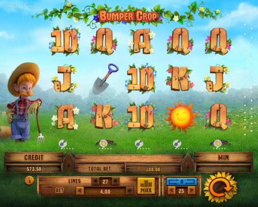 Bumper Crop – это 5-барабанный видео-слот с двадцатью семью фиксированными полосами для формирования выигрышных цепочек. Ставки по ним всегда равны: от одного цента до четырех долларов на линию. Так что на раунд вы сможете поставить не менее двадцати семи центов и не более ста восьми долларов.