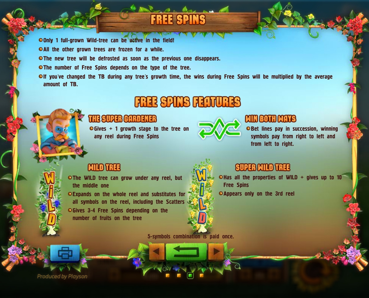 - Фри-спины проходят по той же ставке, какая была задействована прежде, но ее делает казино. В данном раунде символ Wild все время занимает колонку, в которой удалось вырастить лозу. Количество вращений определяется по плодам на кусте. Если это Super Wild, добавляются еще десять спинов.