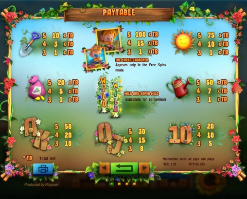 - На любом барабане можно вырастить цветы, которые будут играть роль символа Wild. Для этого нужно постепенно собрать в данной колонке следующие картинки именно в такой последовательности: лопата, мешок, лейка, солнце, фермер. Текущий прогресс будет отображаться под барабаном. На среднем барабане появляется Super Wild, а в остальных колонках простой Wild. Когда вам это удастся, начнутся бесплатные вращения.