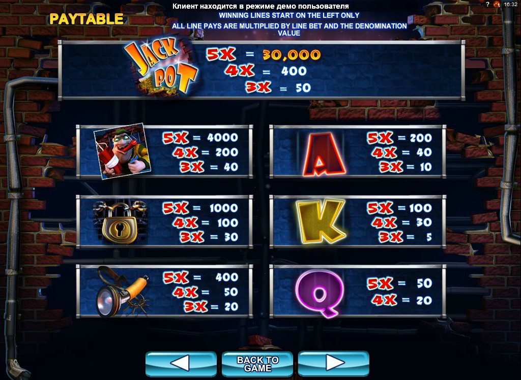 На барабанах игрового автомата можно увидеть картинки с грабителем, замком, отмычками, фонарем и номиналами игральных карт.