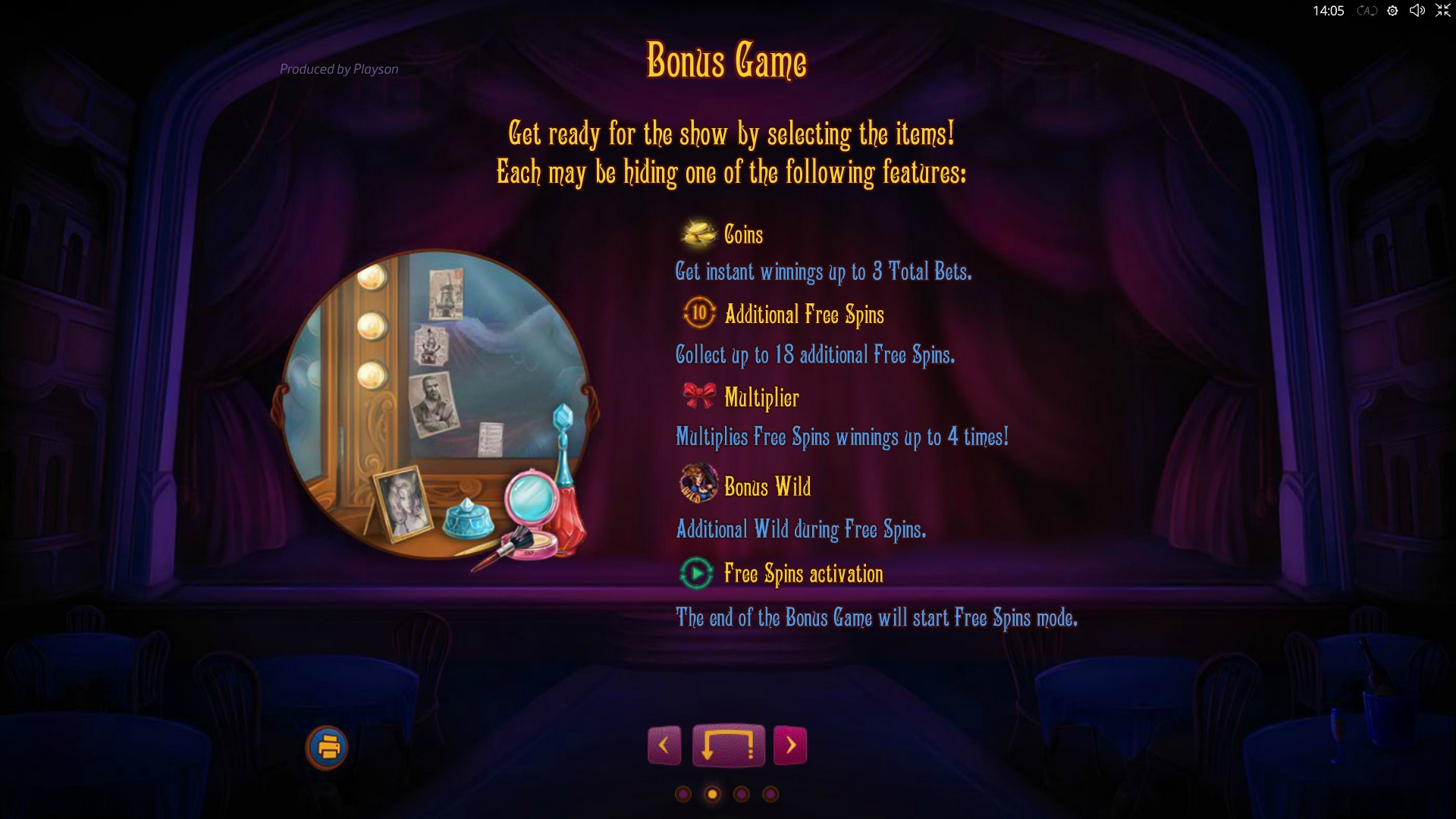 Призовой раунд начинается на дополнительном экране. Вы окажетесь в гримерке артисток и должны будете наугад выбирать разные предметы. Они будут приносить вам следующие бонусы: