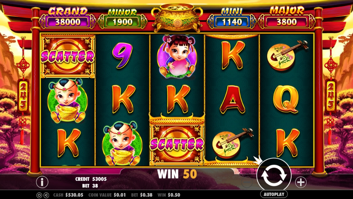 - Wild (Цай Шен) – это джокер. Он не оплачивается, потому что не выпадает на первом барабане. Его роль сводится к тому, чтобы заменять в цепочках другие иконки, кроме скаттеров. Бог также способен начать бонусный раунд с фиксированными джекпотами. Их розыгрыш стартует в случайно выбранных спинах, если Цай Шен появляется на экране.