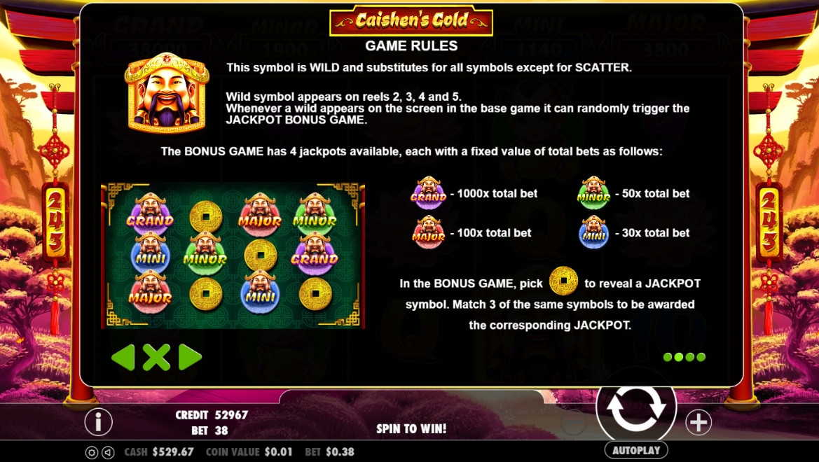 В Caishen’s Gold прогрессивные джекпоты Pragmatic Play не разыгрываются. О фиксированных суммах из бонусного раунда мы говорили выше.