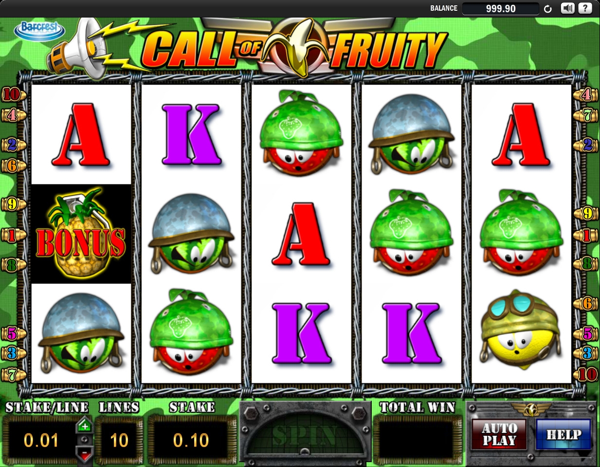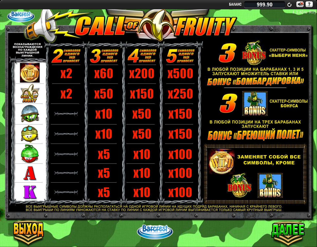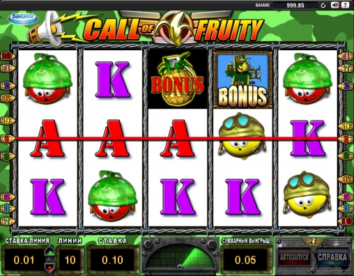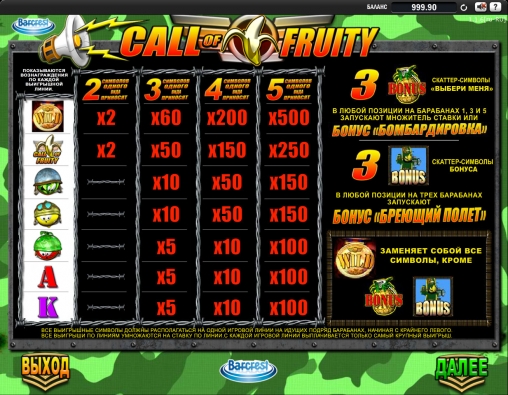 Студия Barcrest представила невероятно забавный видео-слот под названием Call of Fruity, которое многим наверняка напомнит об очень популярной компьютерной игре Call of Duty («Зов долга»). Этот бесплатный игровой автомат также посвящен армии, но в роли солдат здесь выступают фрукты и ягоды, облаченные в военные доспехи. Данная модель не оставит вас разочарованными и наверняка поднимет вам настроение, поэтому советуем обязательно его испытать.