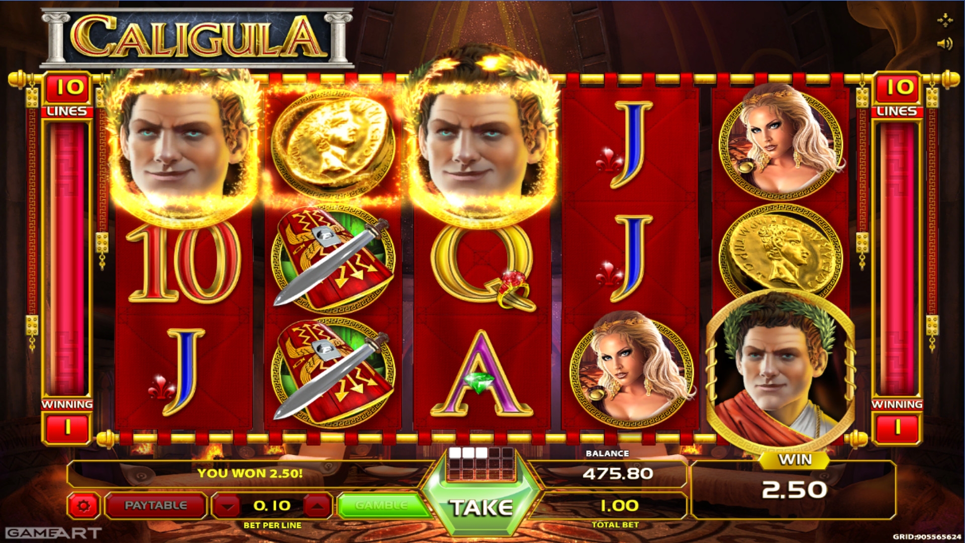 Видео-слот Caligula имеет пять барабанов и десять фиксированных активных полос. На экране одновременно появляются пятнадцать картинок, выстраивающихся в три ряда.